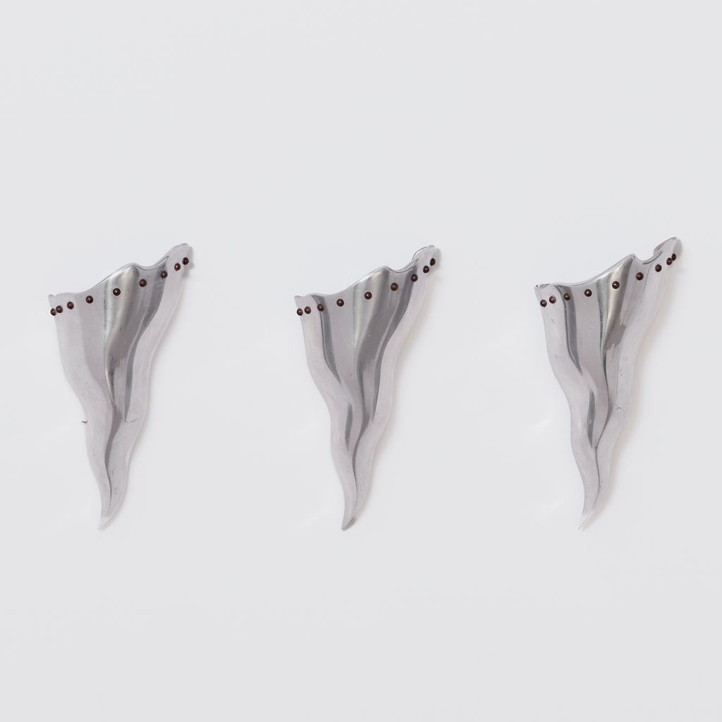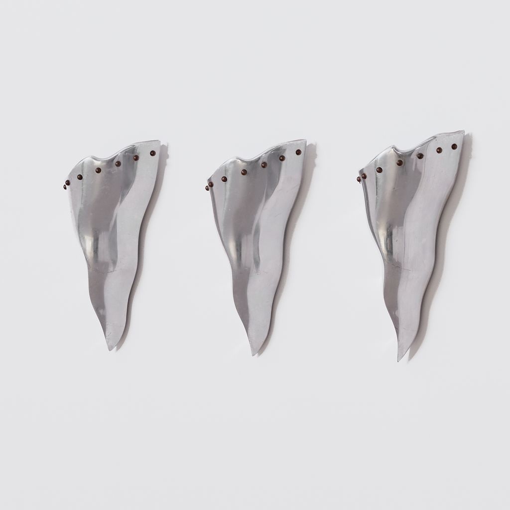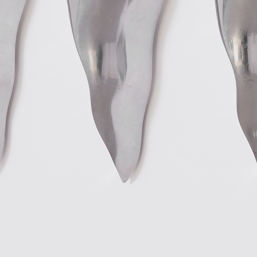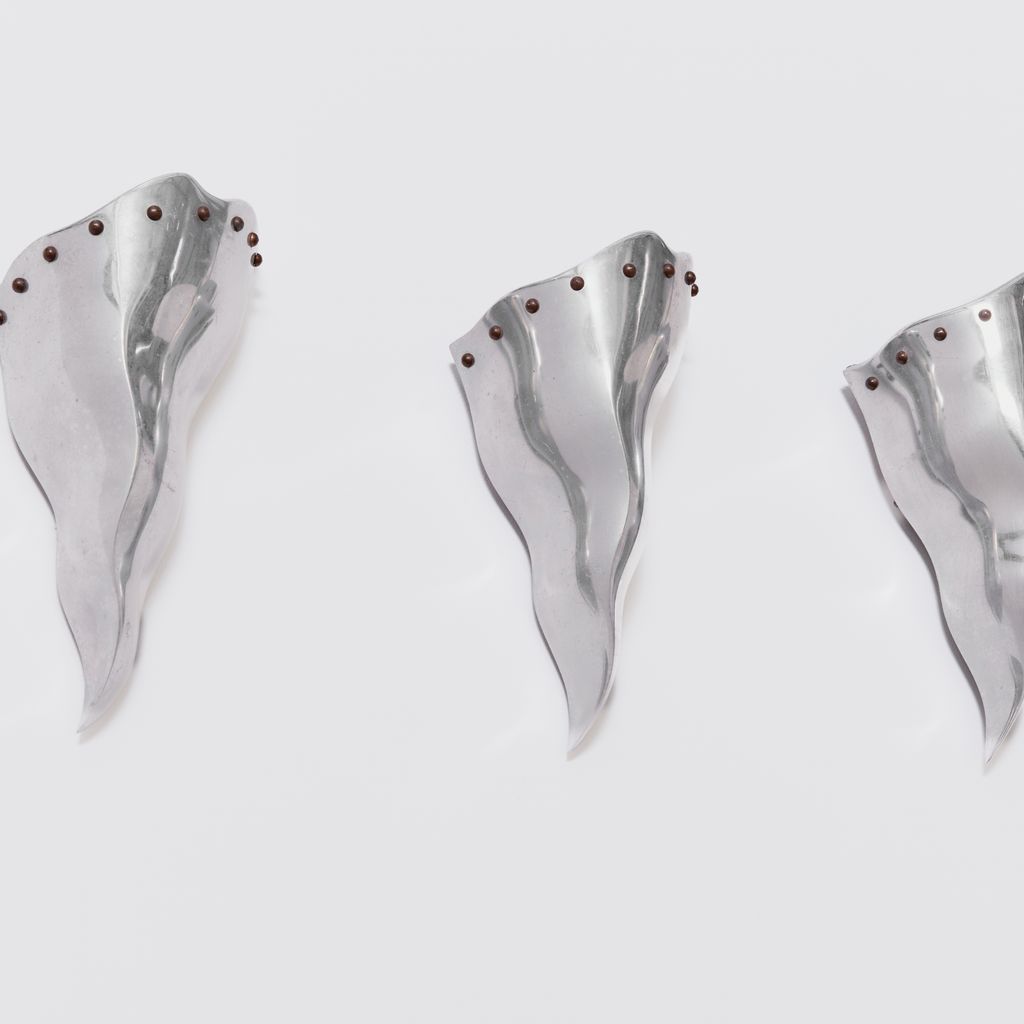 Trio of of postmodern sconces by French designer Bernard Dequet. Known for his undulating, sculptural works in aluminium, these "Cyrano' sconces bear the hallmarks of his distinctive aesthetic. To be hardwired by a electrician. Designer: Bernard Dequet Manufacturer: Lucien Gau
