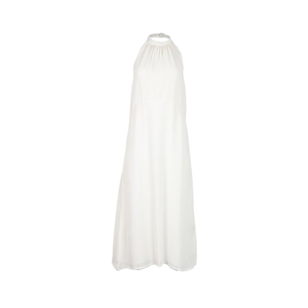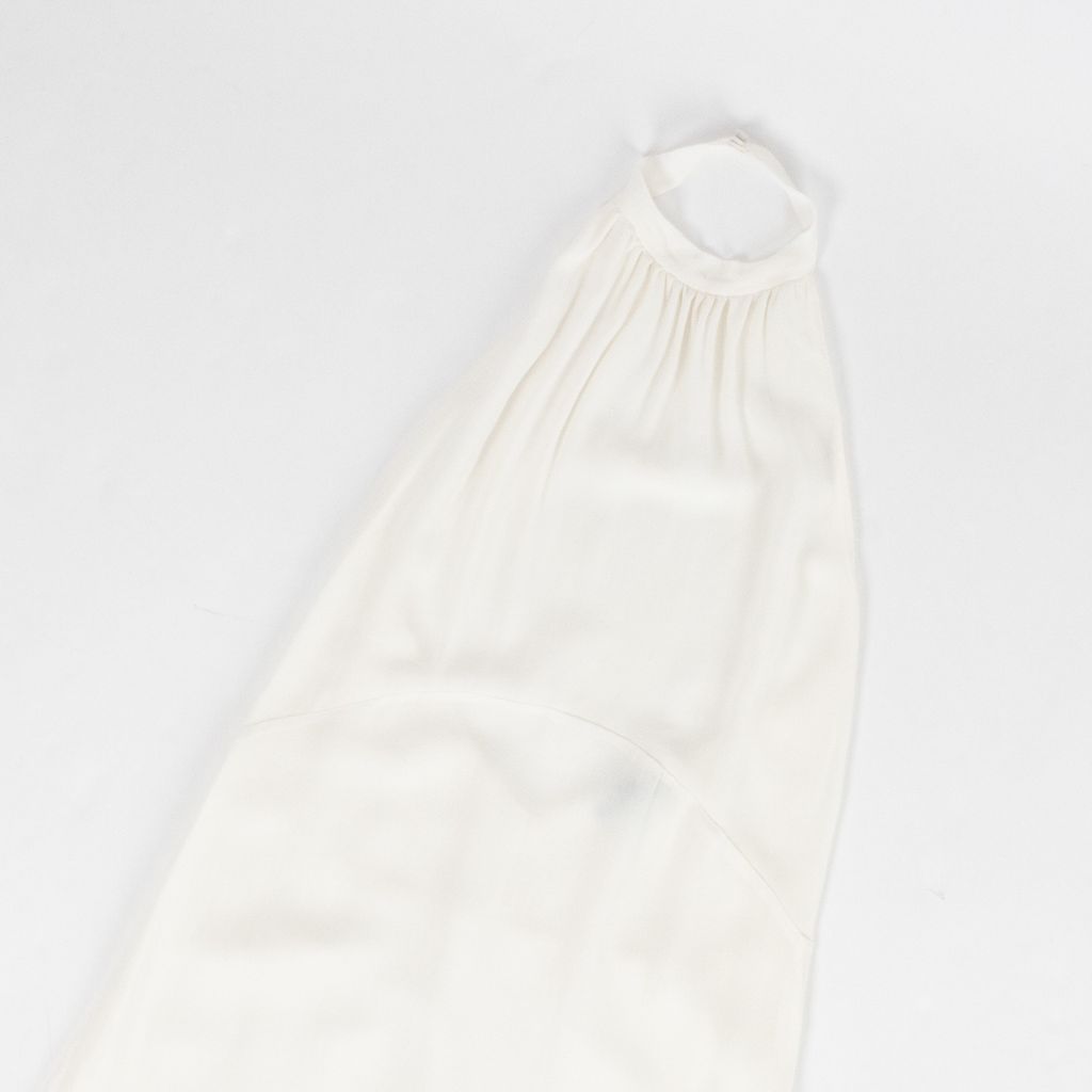Turn up the drama in this semi sheer, low back dress from Trois. Features high neck with button closure, midi length, semi sheer body fabrication, and ultra low back with button closure.