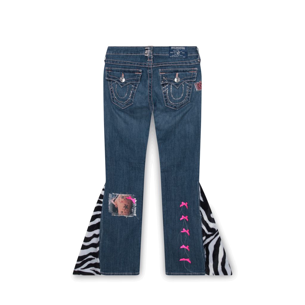 True Religion Jeans feature decorative patches, faux fur flare, and bedazzled pockets.