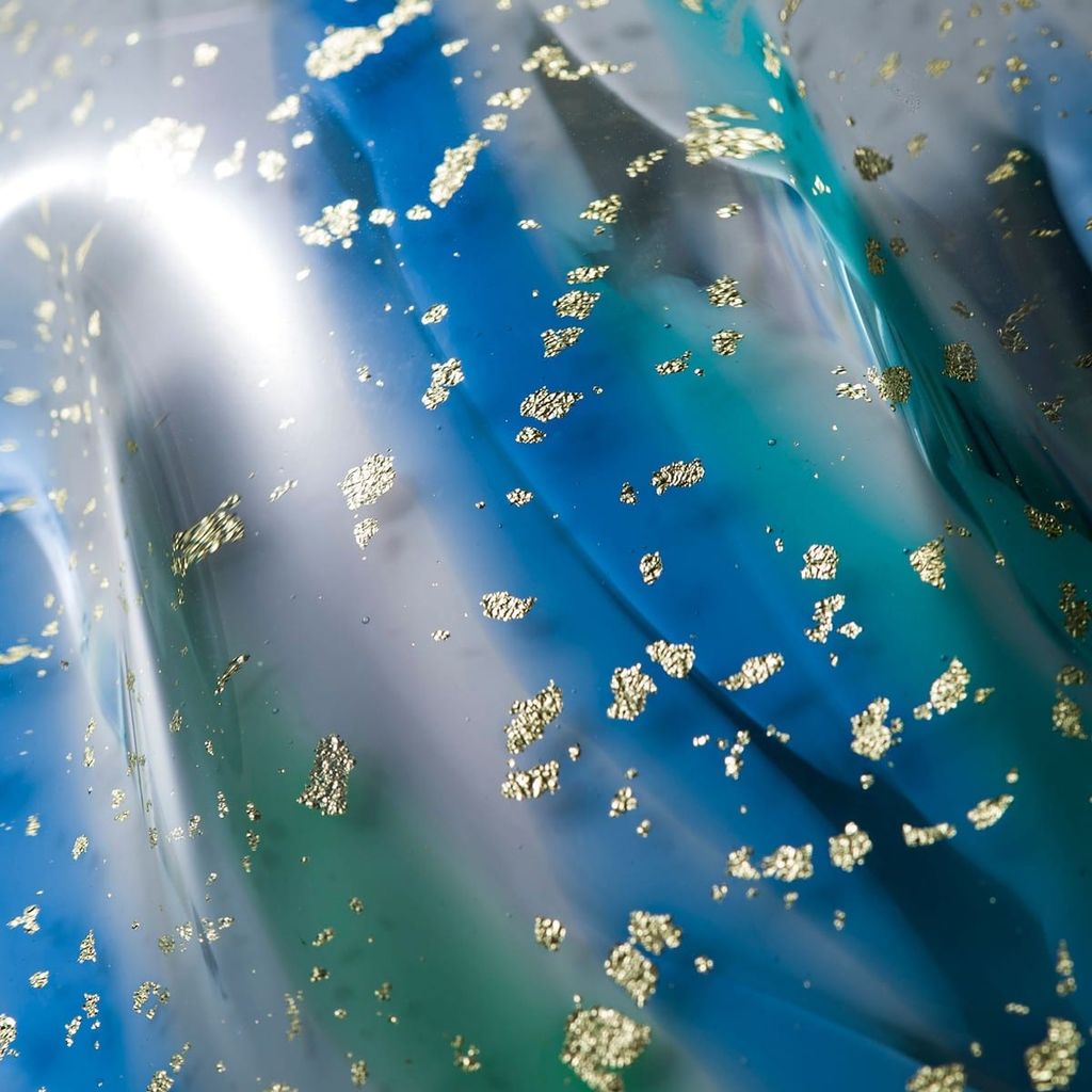 The blue glass and gold leaf are layered on top of the white glass, and then a textured transparent glass is applied on top of that, giving the piece depth and color. If you hang it by a window in your room, you can enjoy how it sparkles even more in the sunlight.