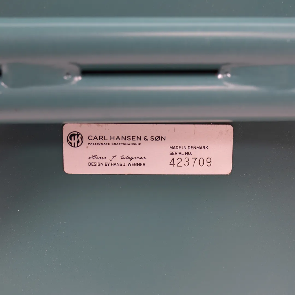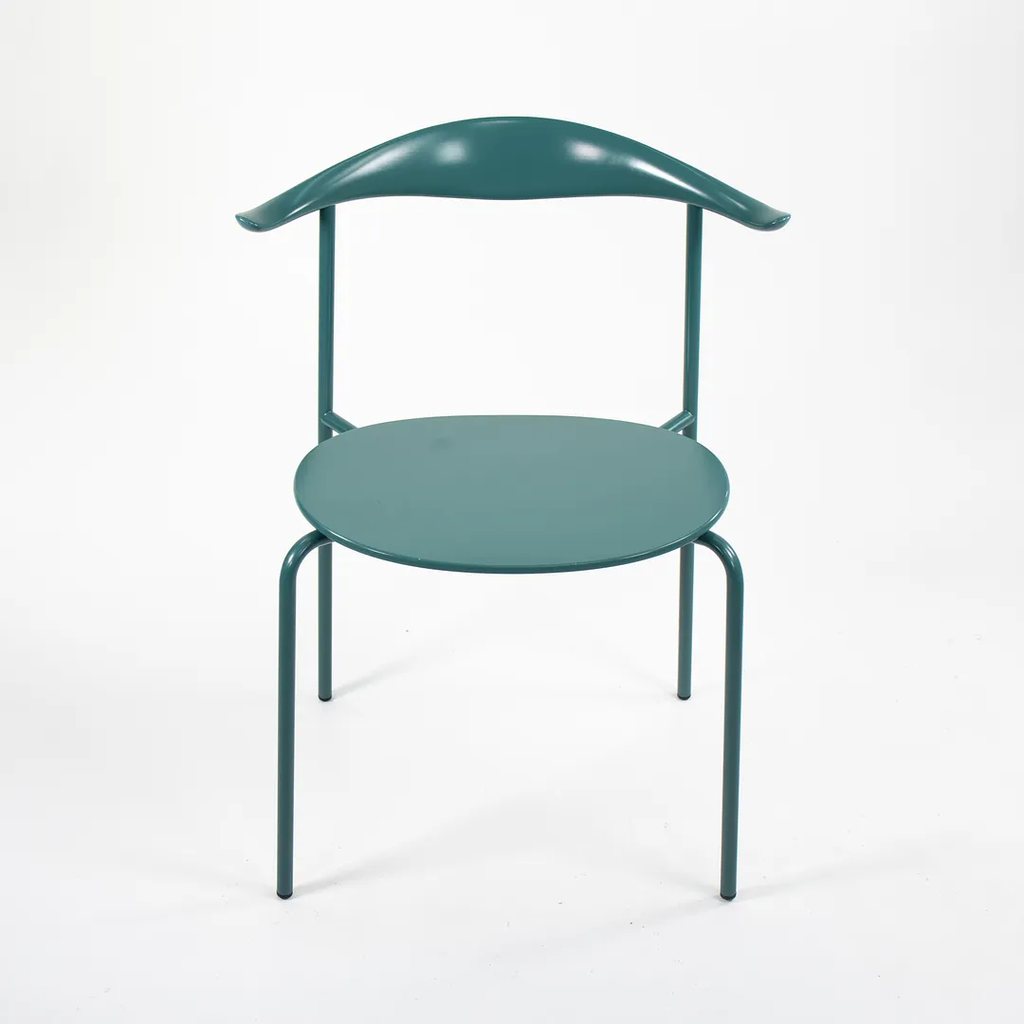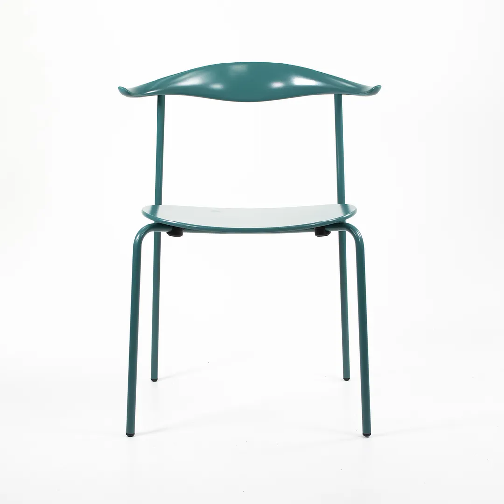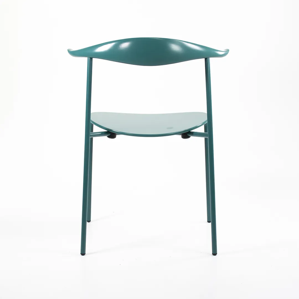 This is a CH88T dining chair made with a turquoise powder coated steel frame, beech back and wood seat. The chair was designed by Hans Wegner and produced by Carl Hansen & Son in Denmark. The chair dates to 2021 and is guaranteed as authentic. Condition is excellent with a slight circular rub mark (barely visible) on the seat and a tiny nick to the paint on the corner of the back. This would be easy to touch-up if desired. See photos. This chair came directly from Carl Hansen. It was likely never used in a home or office setting but may have been a display model within their showroom.