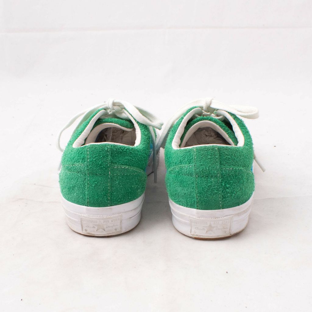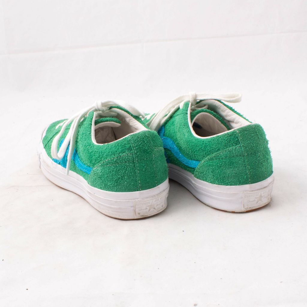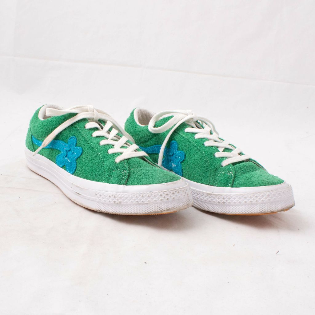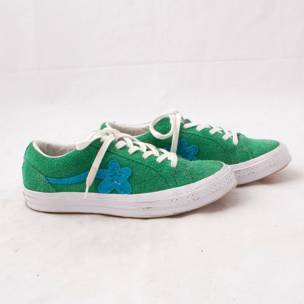 In good condition, Golf Le Fleur sneakers from Tyler The Creator x Converse. Features low-profile design, suede upper with contrasting white stitched lines throughout, and signature floral motif at quarter panels.