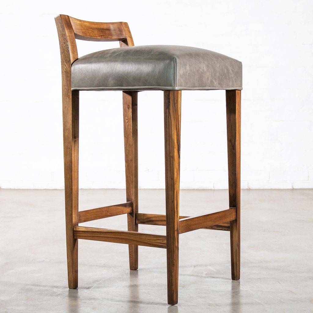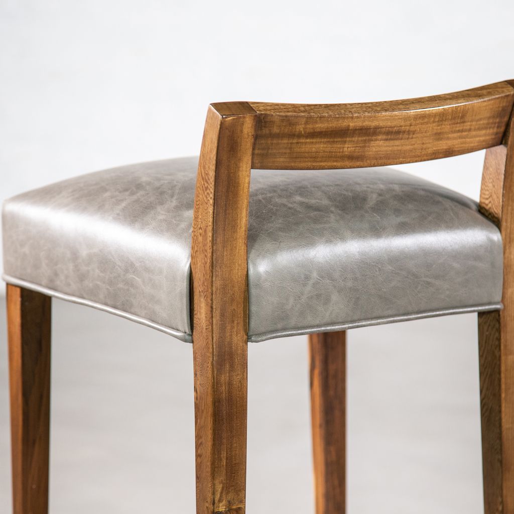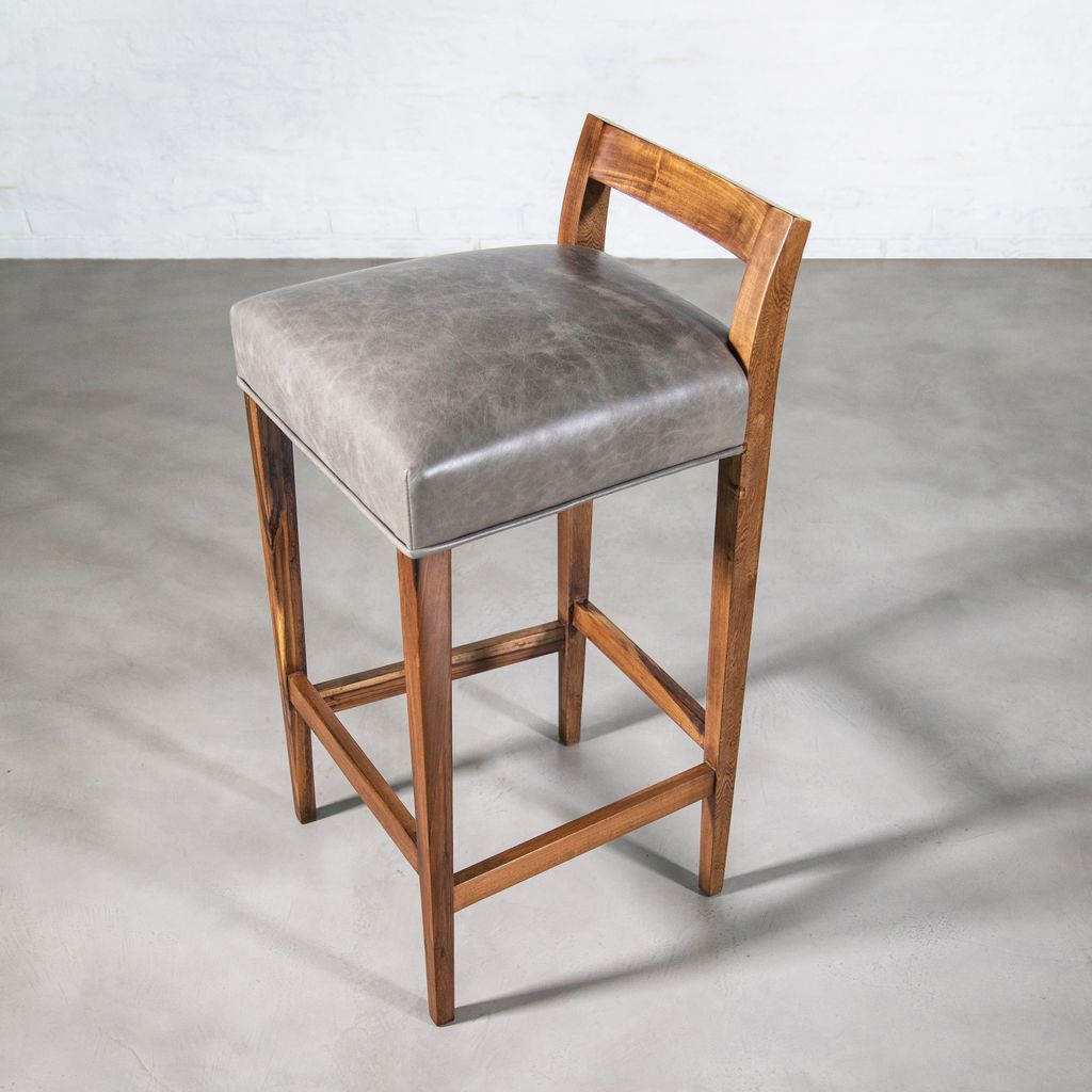 The Umberto Bar Stool is one of Costantini’s original seating designs, featuring a modern, low, carved solid wood back with a tight seat, and optional bronze footrest. This is a new piece, usually in stock, ready for quick-ship, and can be made in any material, and any finish.