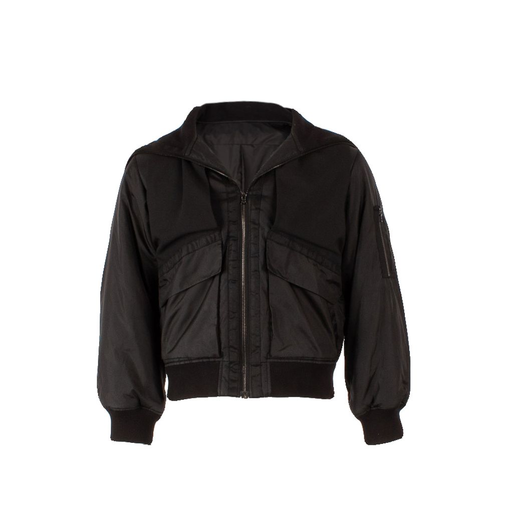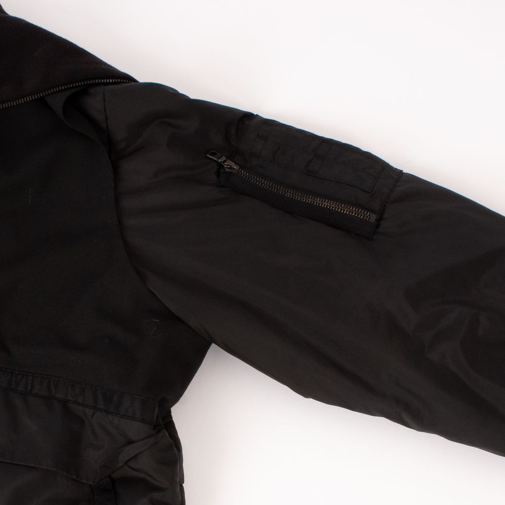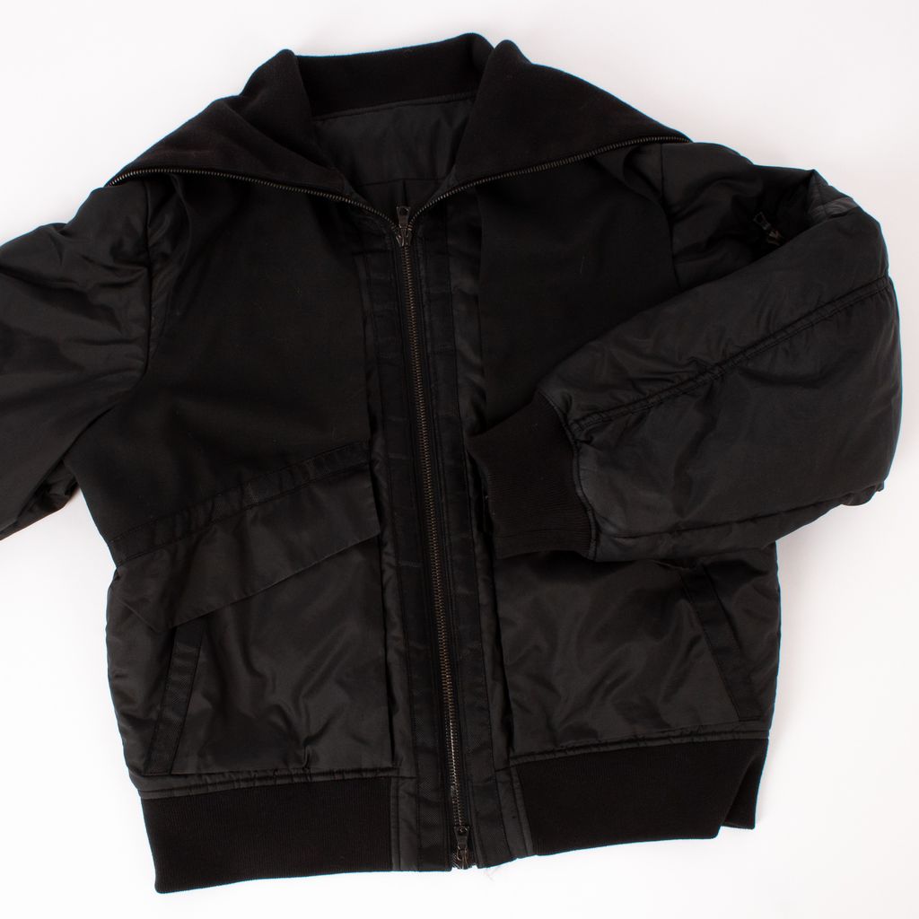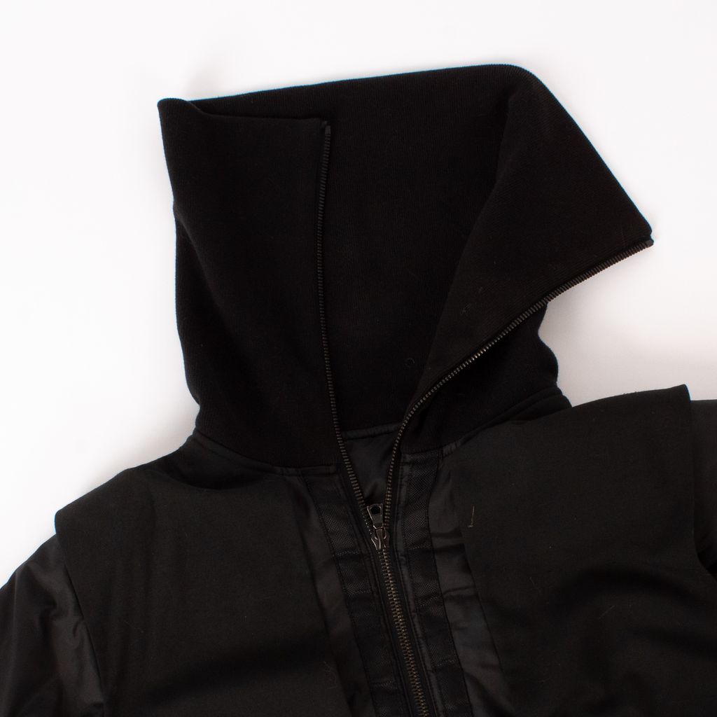 Listed as a sample for an unknown brand, this bomber is loaded with cool details that make for a unique and cool piece. Features ultra high zip neck with open fold capabilities, rib knit neck, wrists, and waist bands, set of interior pockets on chest, fabric vest overlay, font pockets with flap cover, and small pocket on left arm. Sizing is not listed for this item, refer to measurements for exact fit.