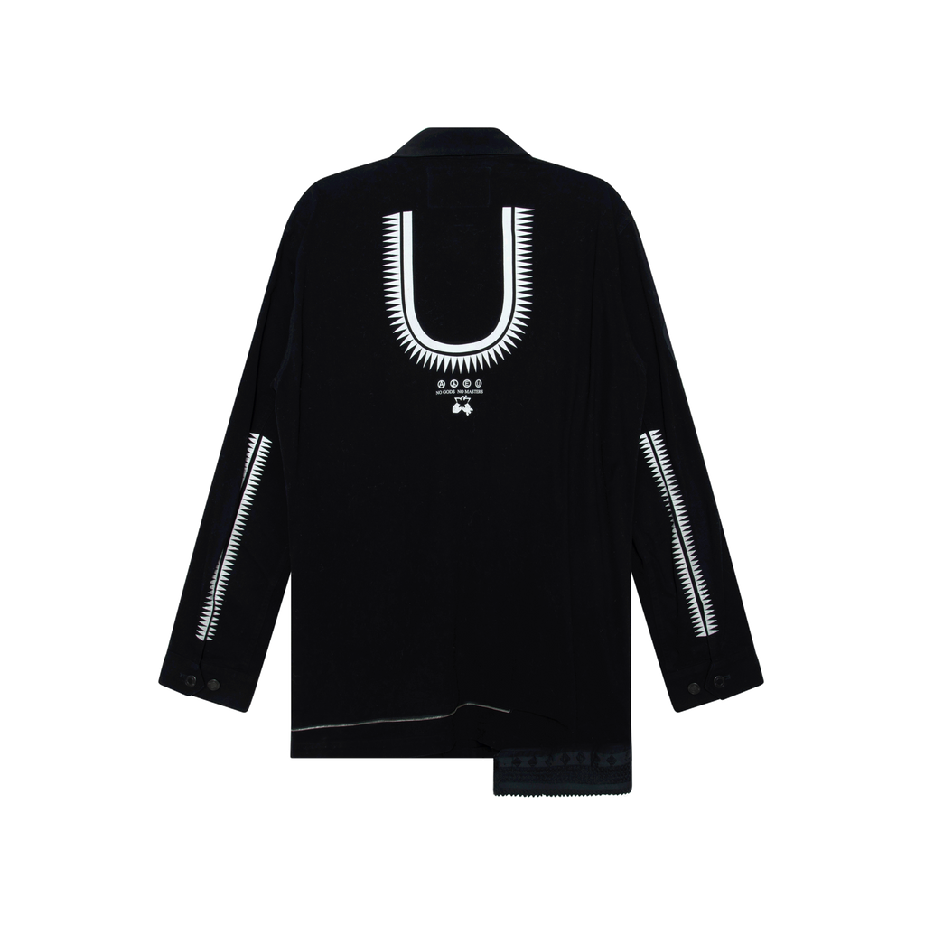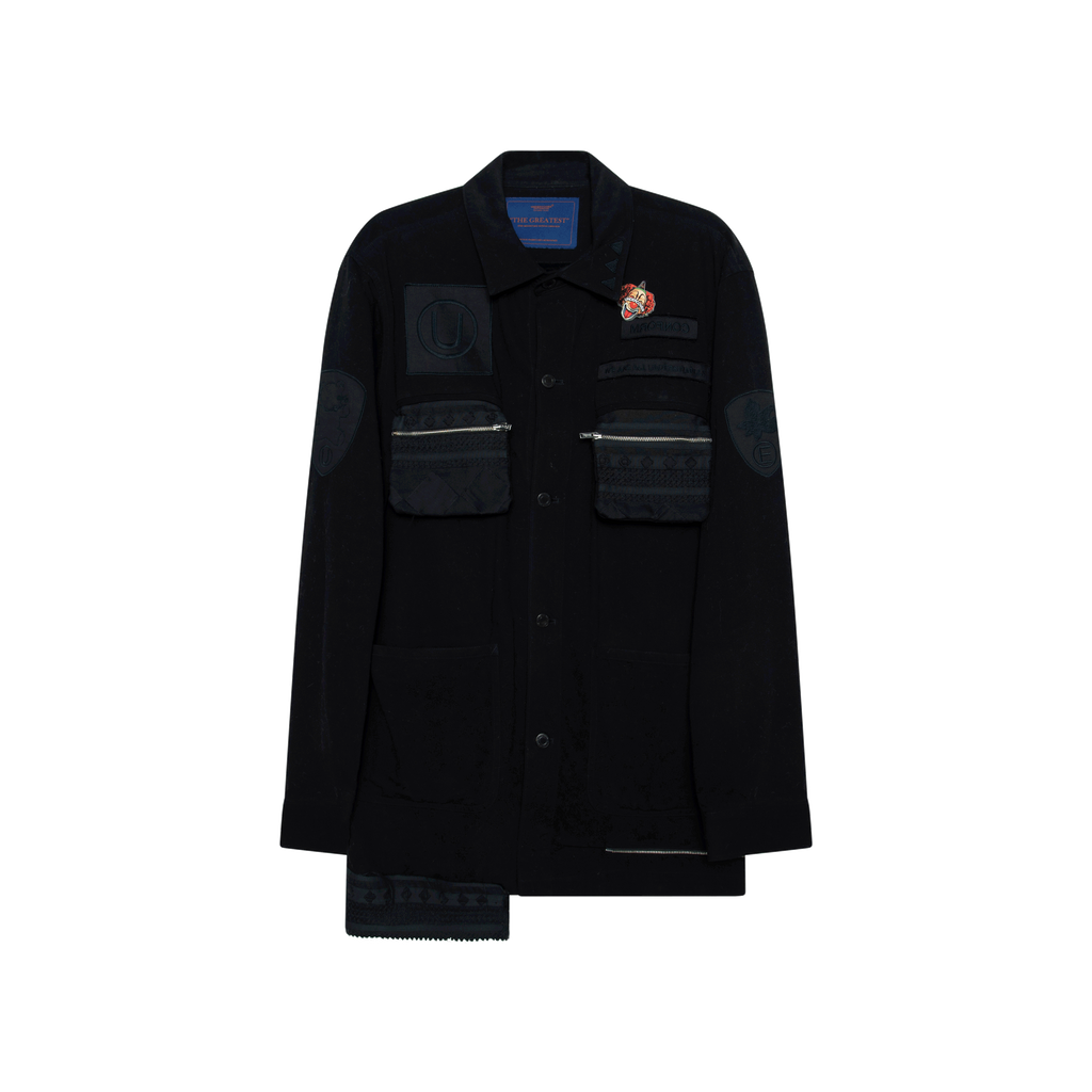 Undercover "The Greatest" 25th Anniversary Scab Jacket features front button closure, patchwork through out, two front zip closure pockets in the chest, two front parch pockets, and U design detail on the back.