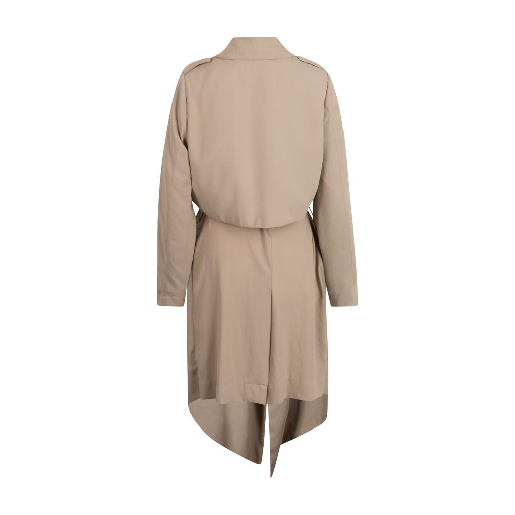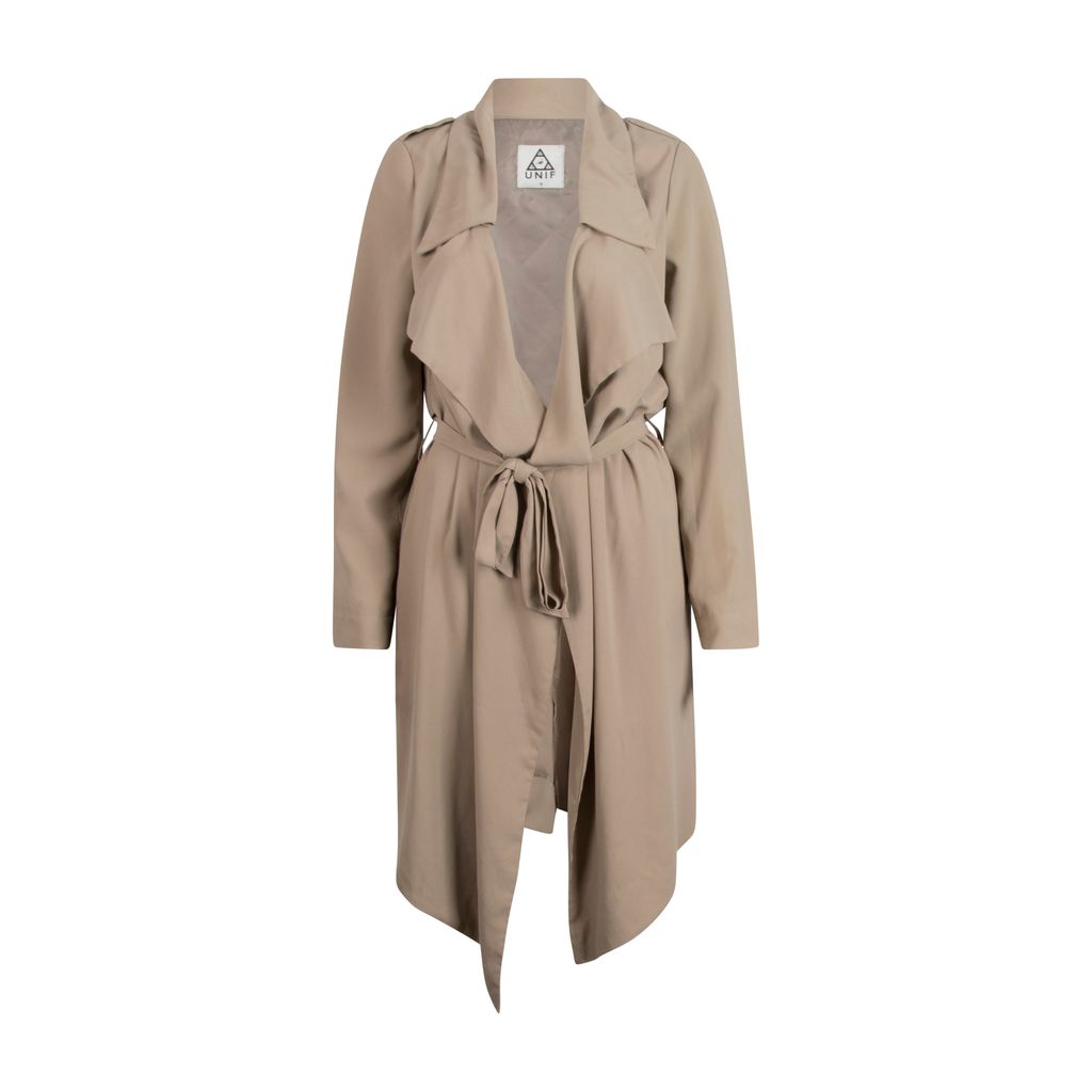 This light weight coat from UNIF features a wide point collar neckline, open front closure, removable belted waist, and has a draped mid-length silhouette. Gently worn, in excellent condition. Can be worn as a coat/dress.