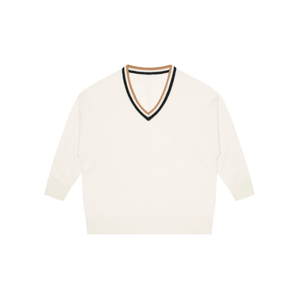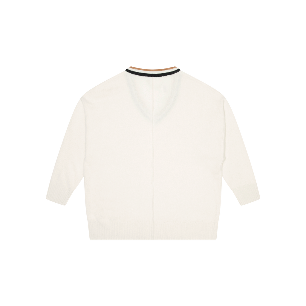 Unsubscribed V-Neck Cashmere Boyfriend Pullover features ribbed striped v-neck, ribbed cuffs and hem, and oversized fit.