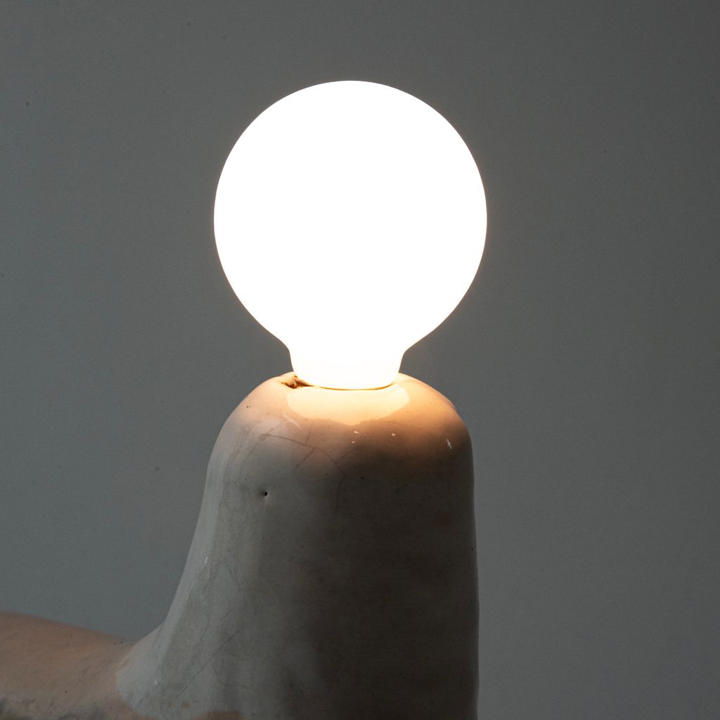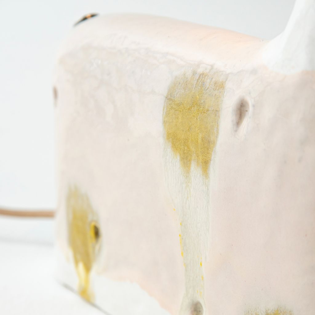 The miniature lamp is inspired by a similar large-scale example by Hun Chung Lee that is in the collection of the Los Angeles County Museum of Art. With colors set in pastel tones, the lamp has a light pink glaze with yellow dot pattern ceramic body and comes with a custom rose colored cord and US electrical plug. The light switch is touch sensitive with three levels of brightness. The item is an edition of 6, plus 2 APs.