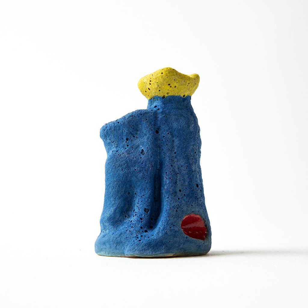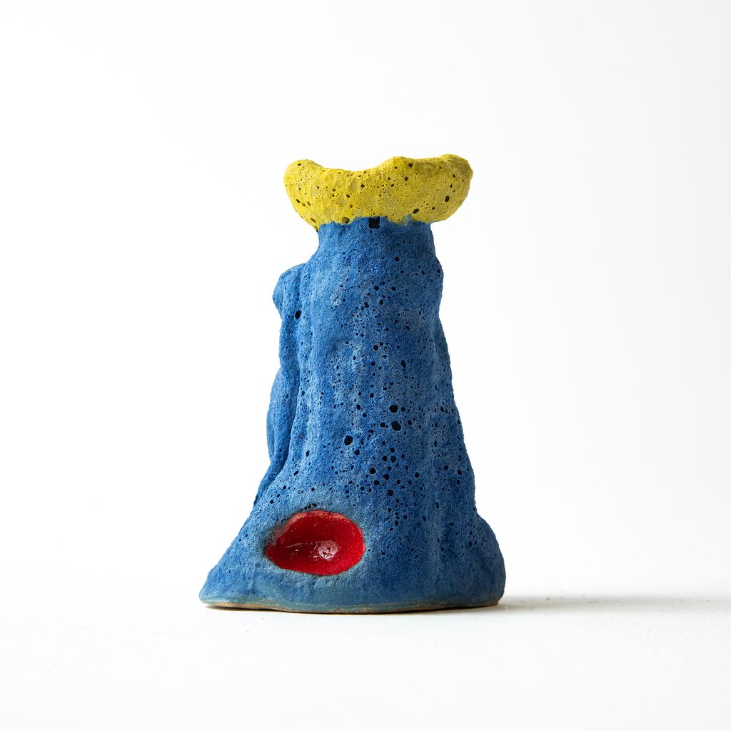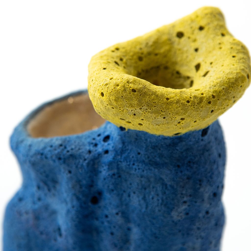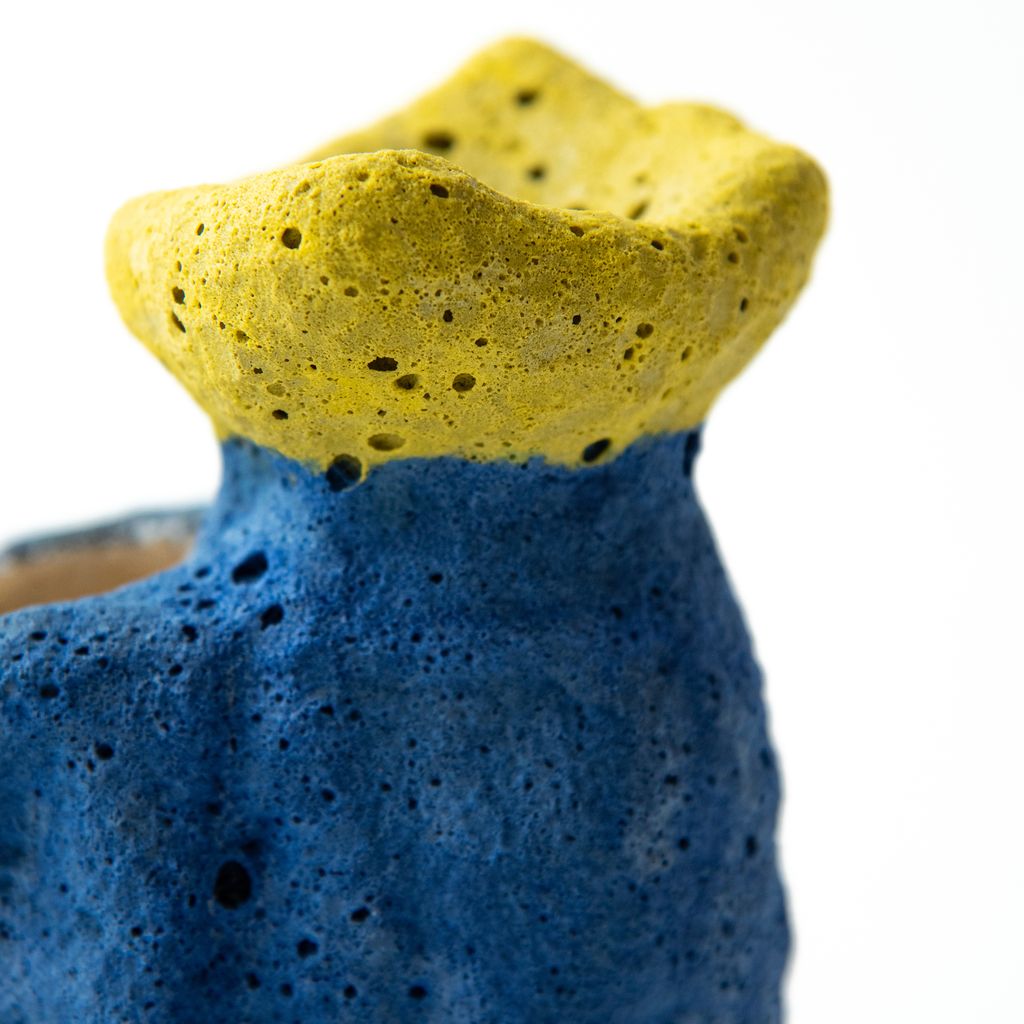 Featuring a predominantly blue body, this vase by South Korean artist Hun Chung Lee has an opening at the top of the organic form to hold flowers. The unique design has a rough, porous texture with details of yellow and glossy red. The item is an edition of 2 APs, plus 6 standard editions.