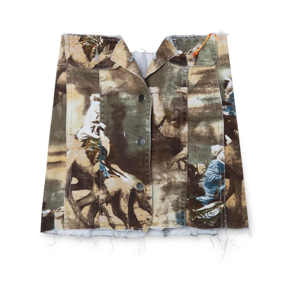 The upcycled bustier is made of a second-hand Cottonade jacket. Unstitched together again as a bustier.