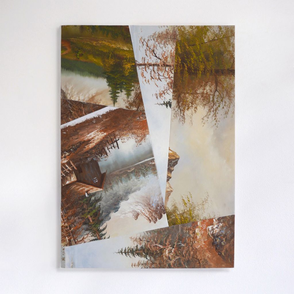 The "Upcycled Painting Series" introduces artworks made from antique oil paintings found in flea markets around Paris. Each work presents a unique composition in which the juxtaposition of different elements creates a deconstructed landscape.