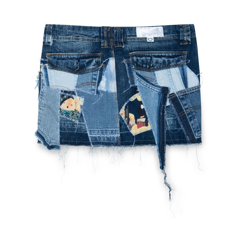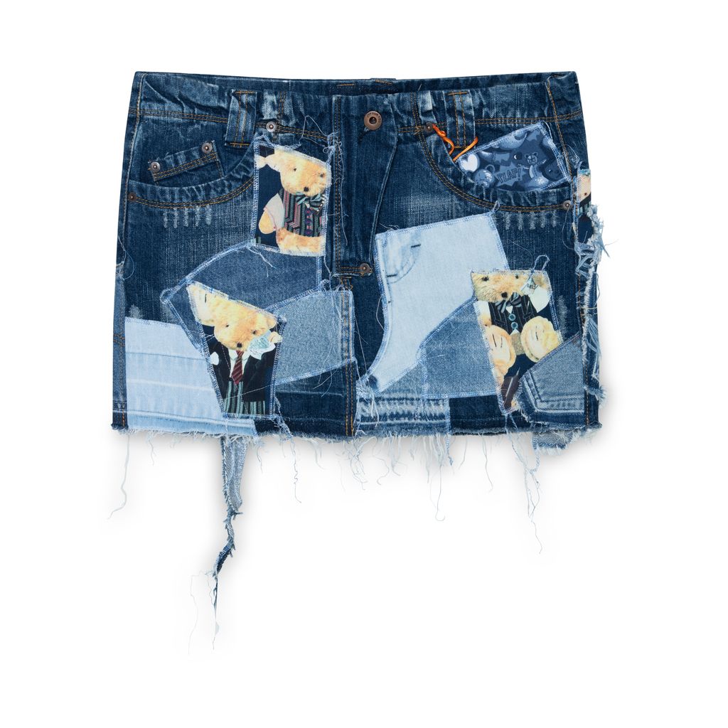 The Upcycled patchwork mini-skirt is made of different second hand & Cottonade pants pieces, unstitched one by one and stitched together again as a patchwork.