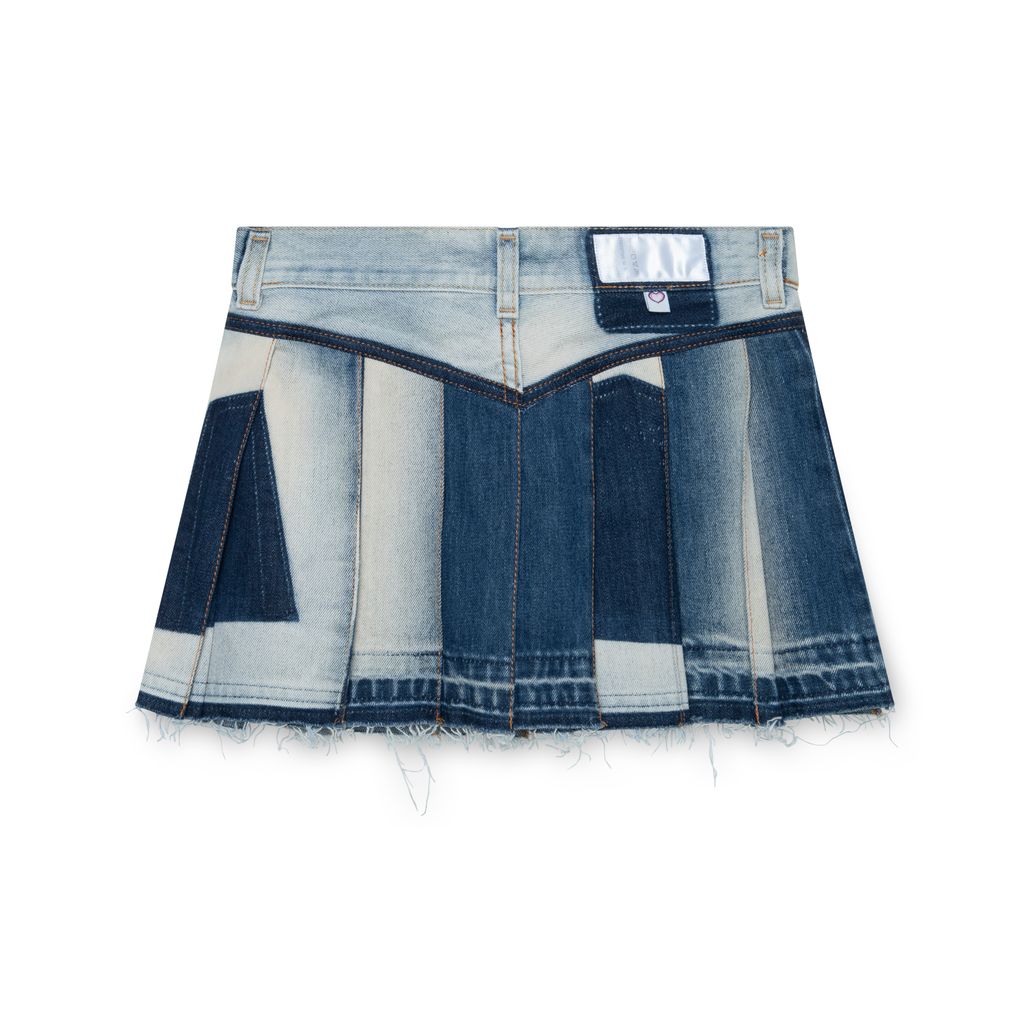 The Upcycled super mini-skirt is made of different second-hand Levi's pants, unstitched one by one and stitched together again as a patchwork. The fabric is pleated by hand to form this skirt.