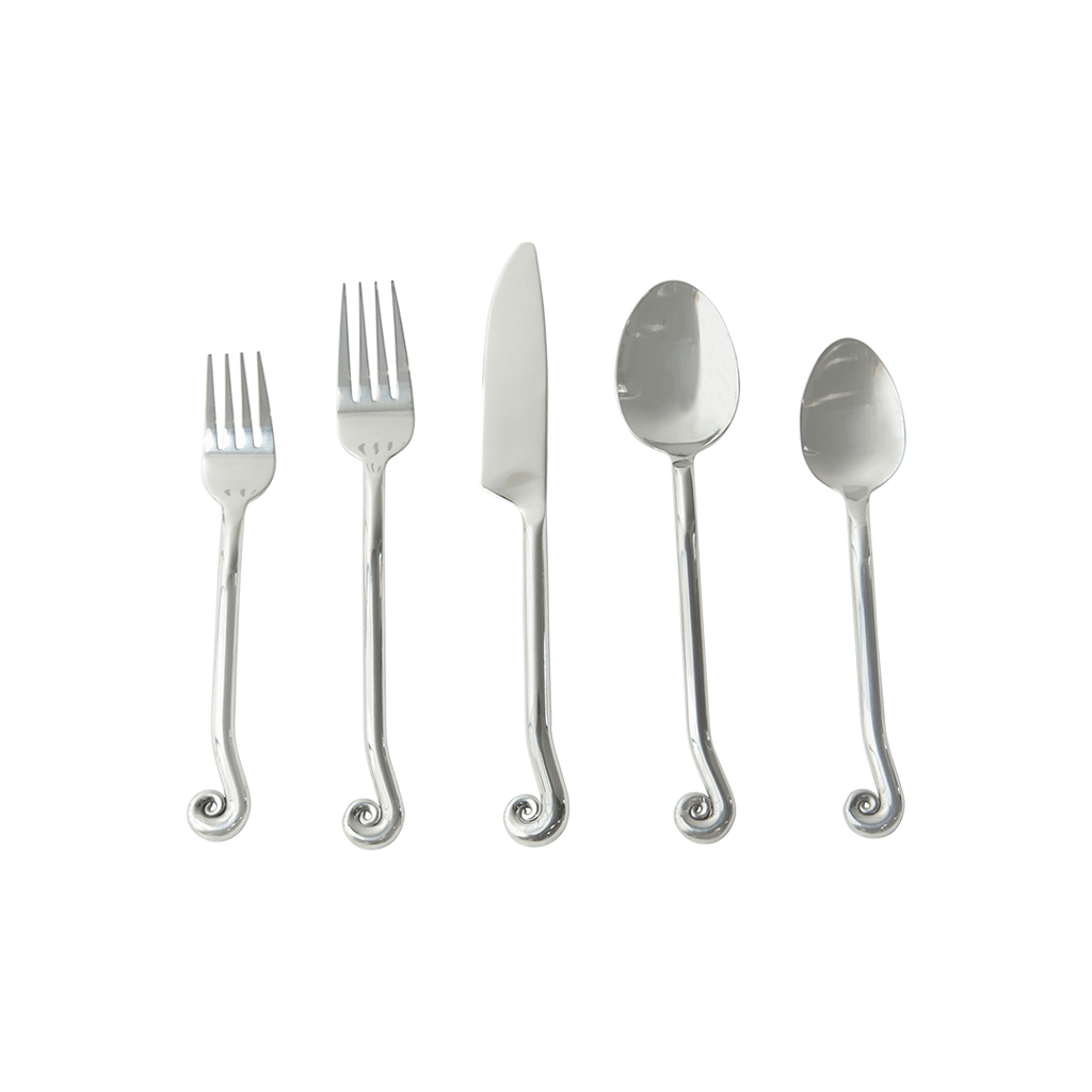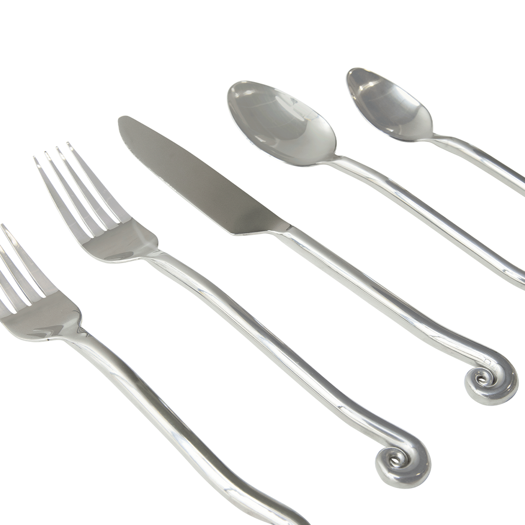 Silver five-piece handmade cutlery set with spiral handle detail.
