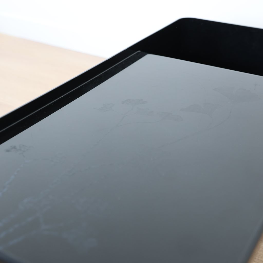 Rare table by Patricia Urquila for Kartell 2004 with a very faint etched flower design throughout top surface in solid black. She only made clear versions of this table, but this is a rare solid black sample version of this table from the Kartell store. Use as a smaller lower profile coffee table or laptop in bed table.