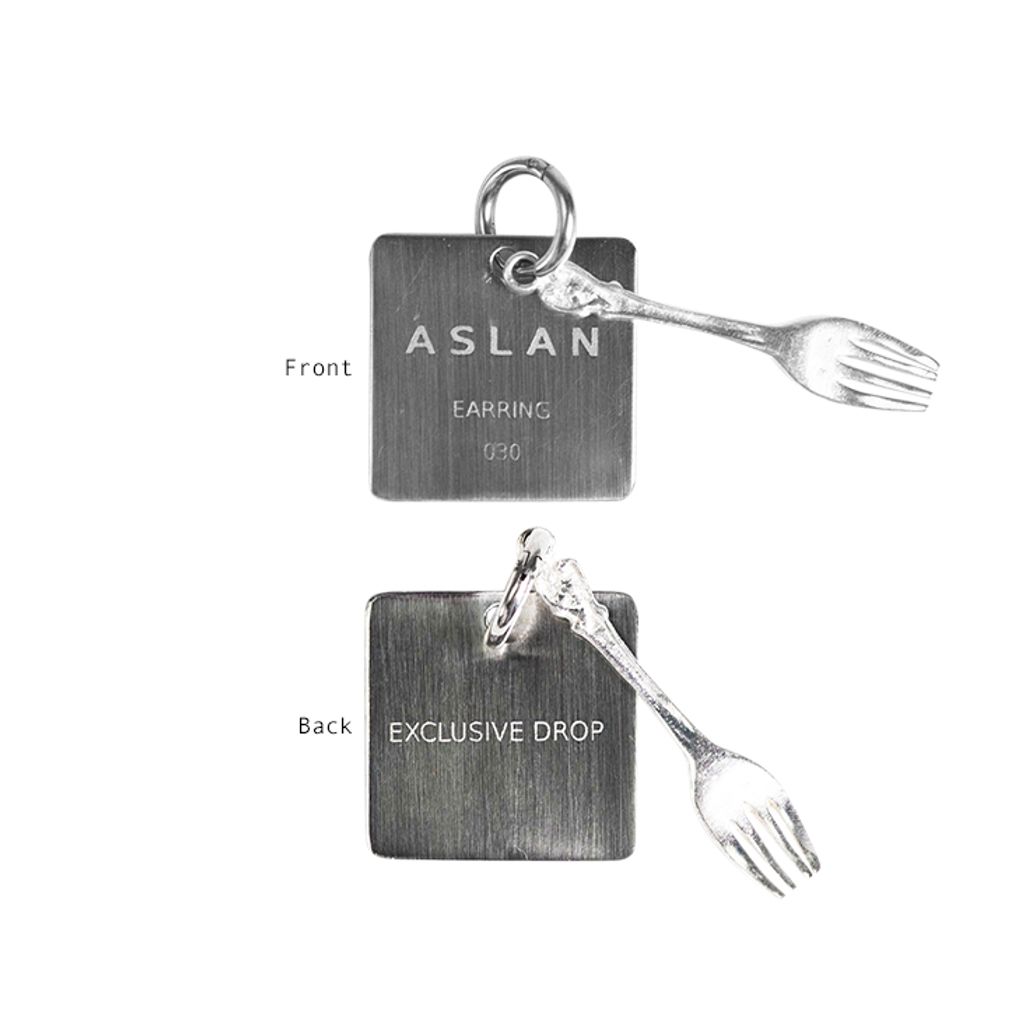 Utensil Tag Earring 09 features fork charms attached to engraved stainless steel monochromatic tags.