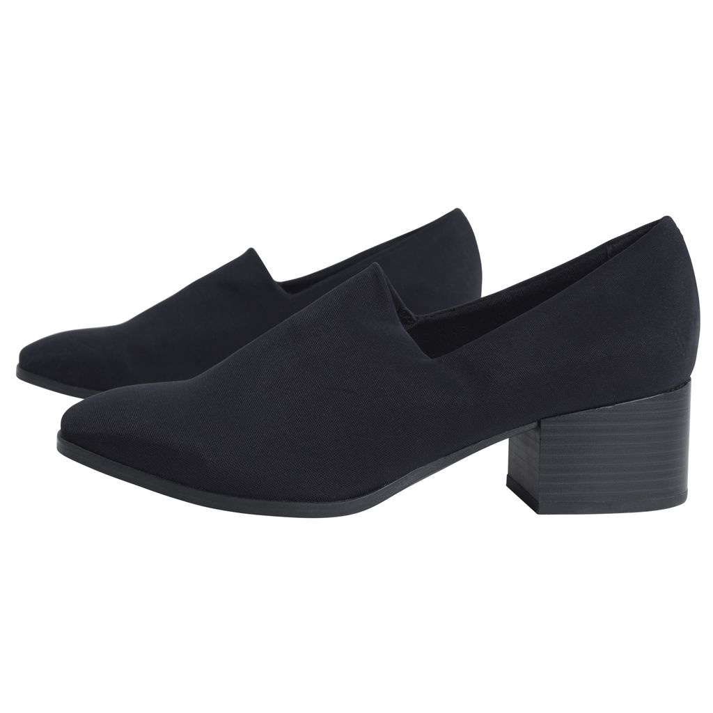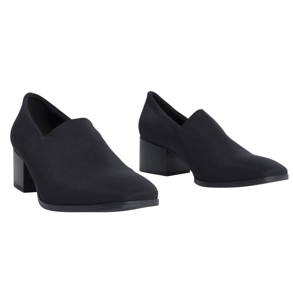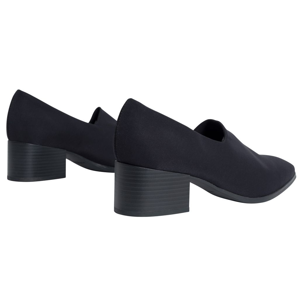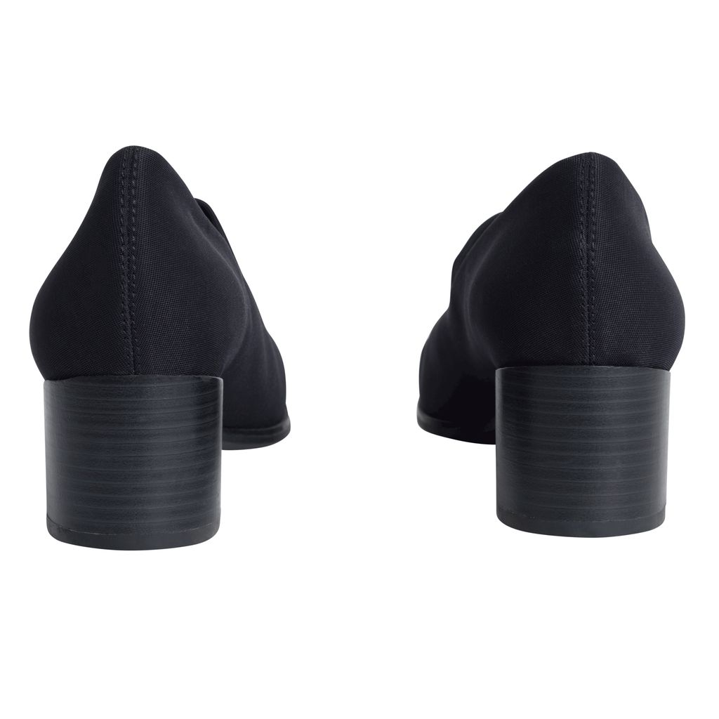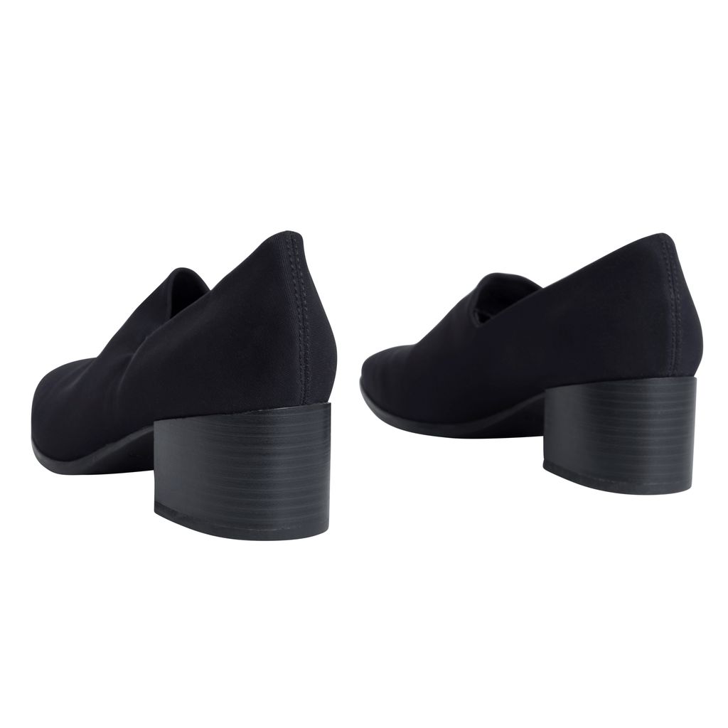 Black pumps with a leather block heel and a man-made material for the exterior.