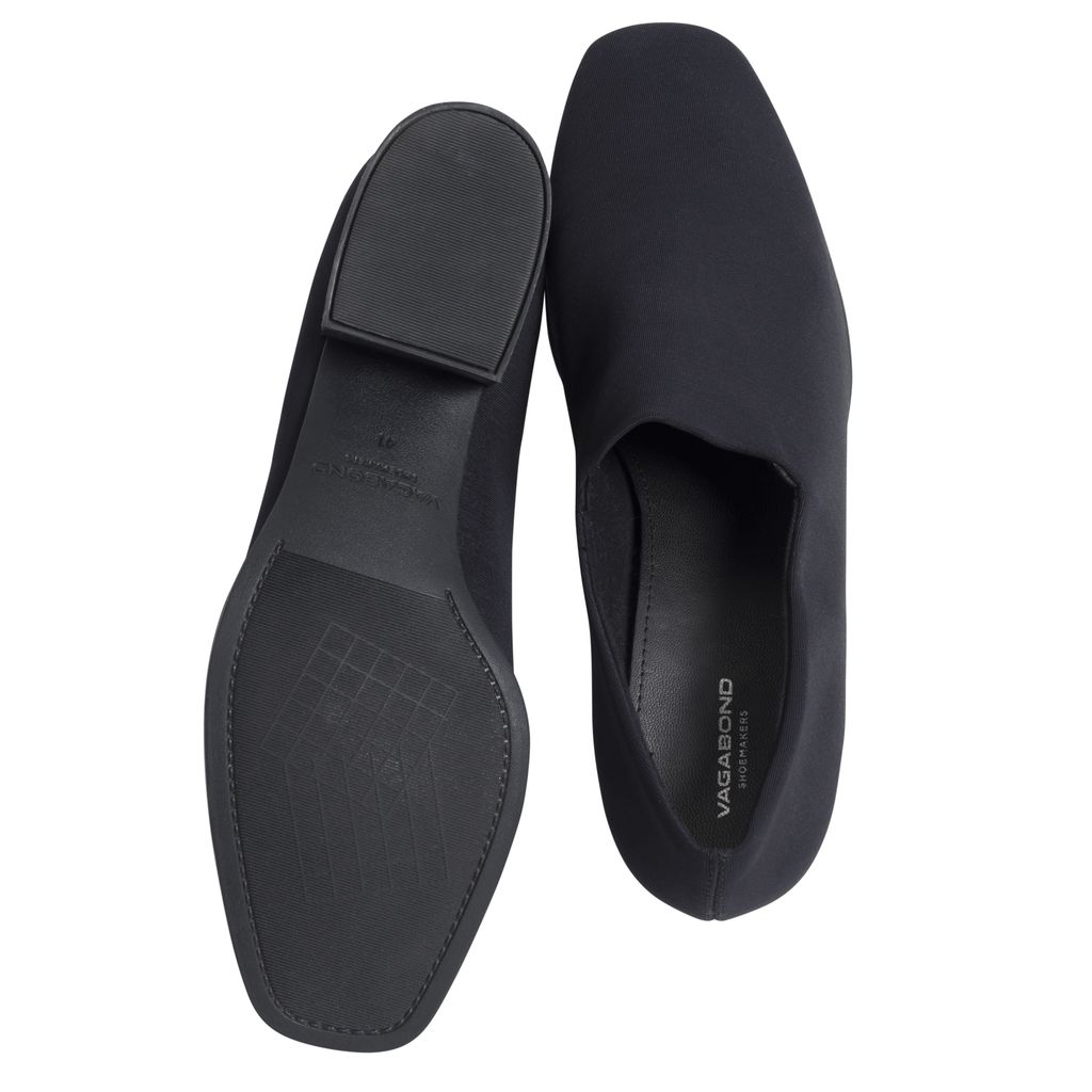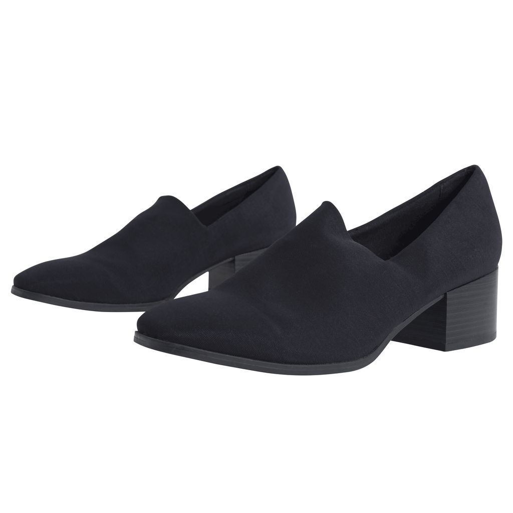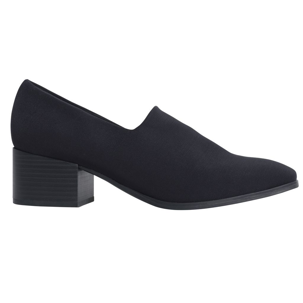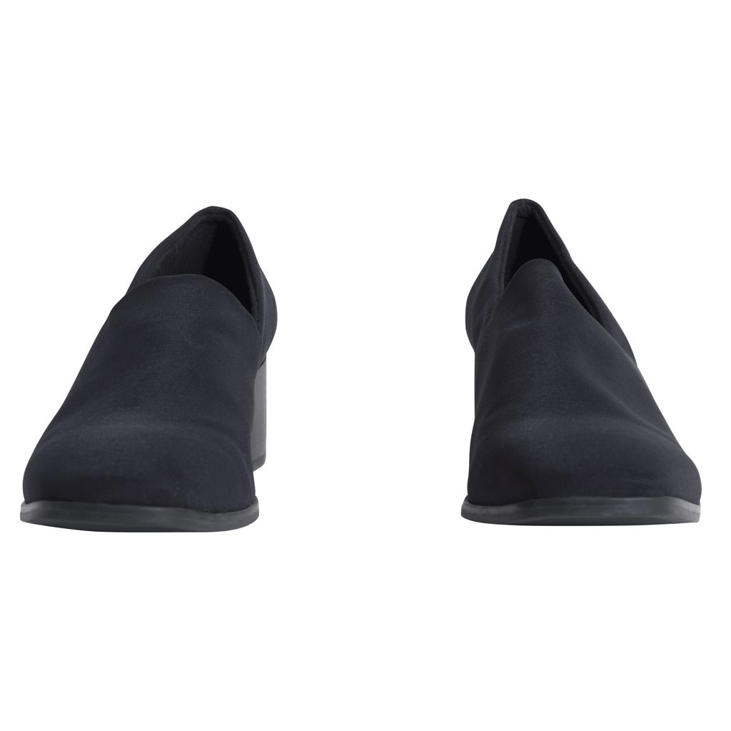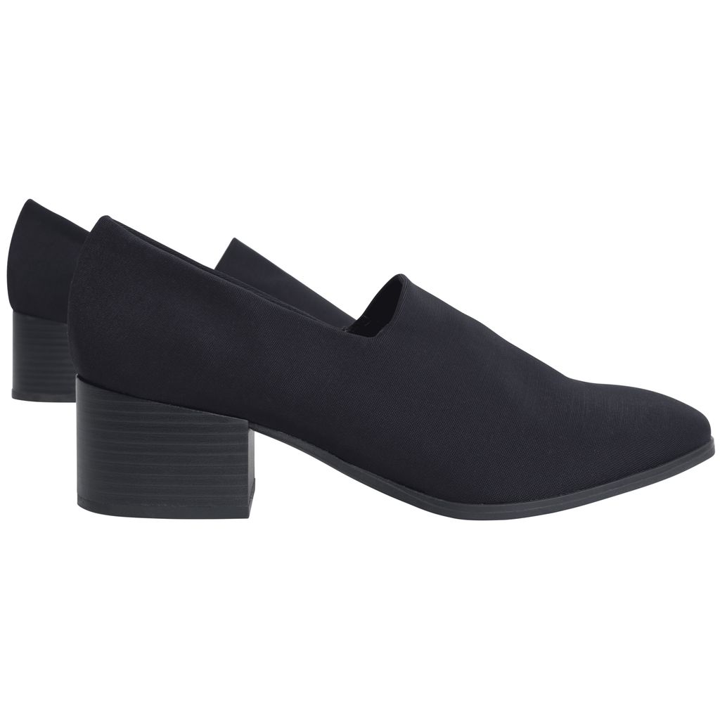 Black pumps with a leather block heel and a man-made material for the exterior.