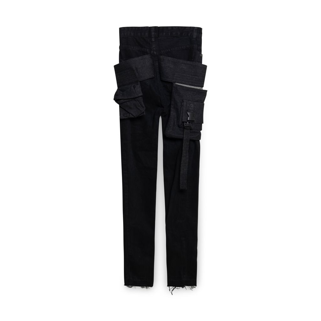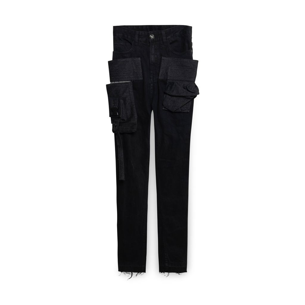 VAL Kristopher Multi Pocket Black Jeans features slim fit, utility pockets on sides, and raw hem.