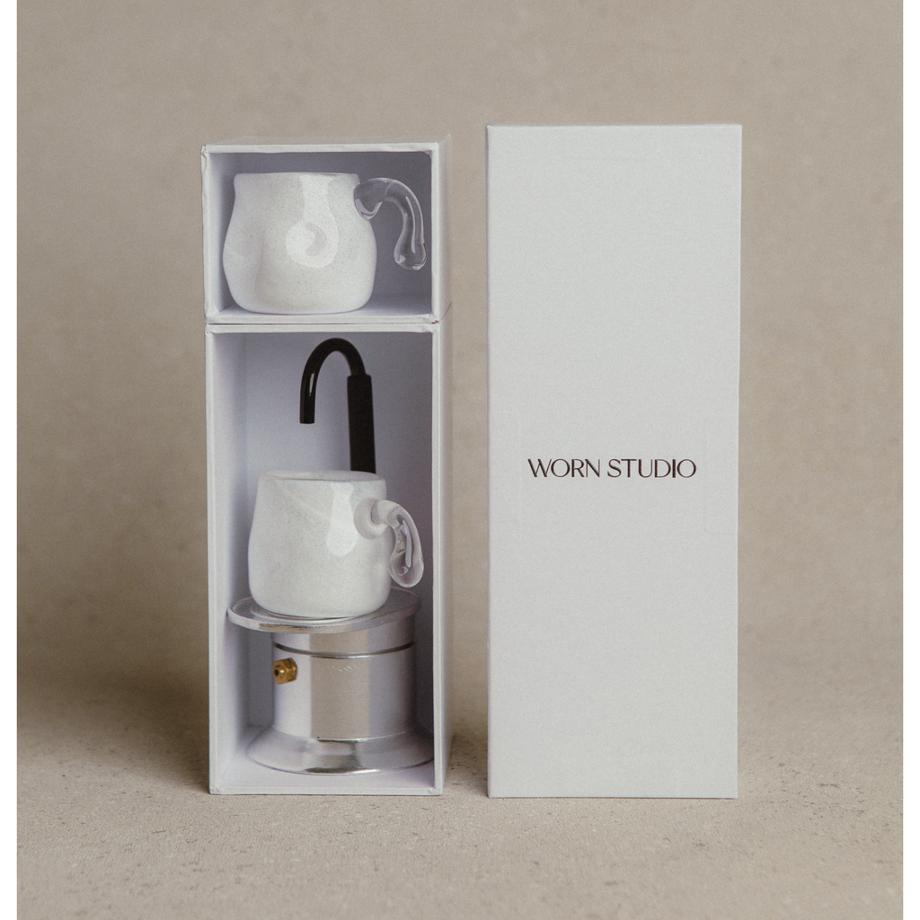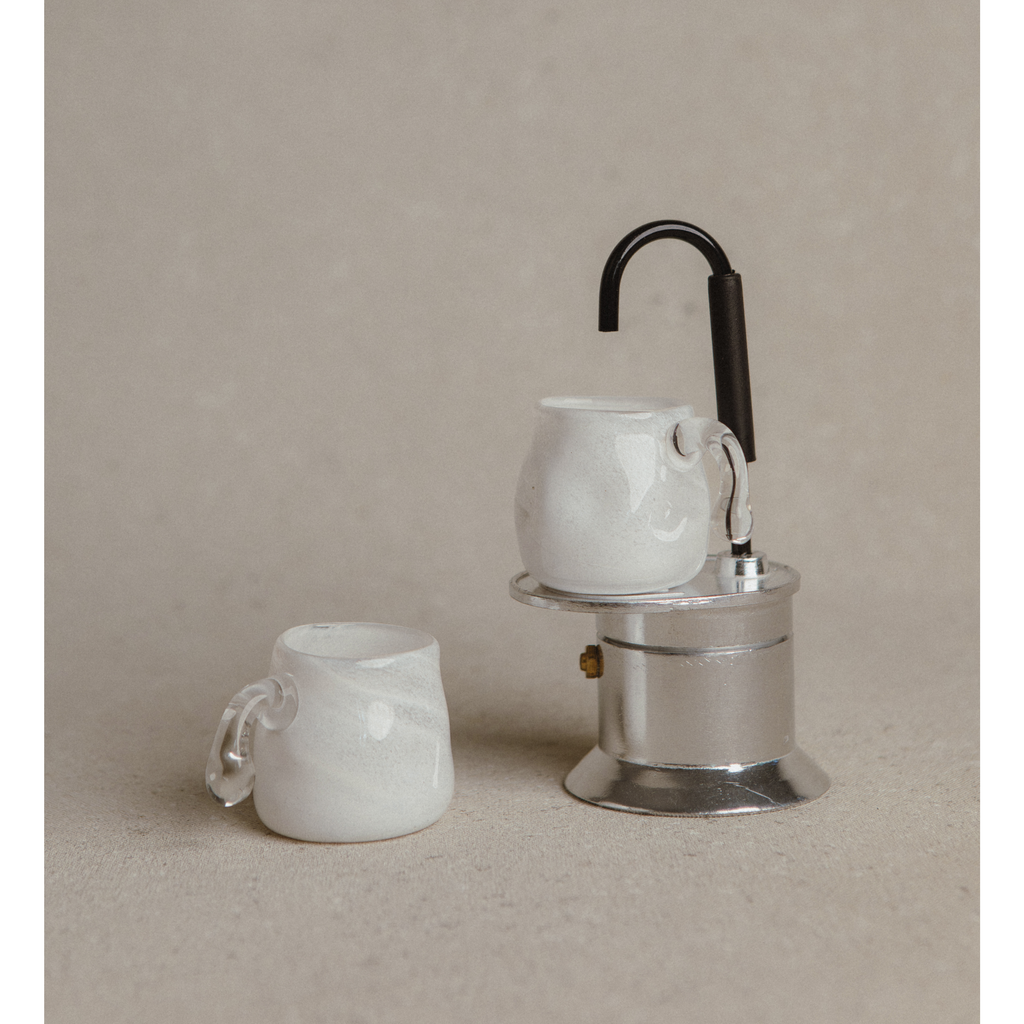 Coffee meets sophistication. A moka pot with two hand-blown glass cups. This is a charming work of art and design that celebrates one of the most brilliant examples of a poetic attitude toward design.