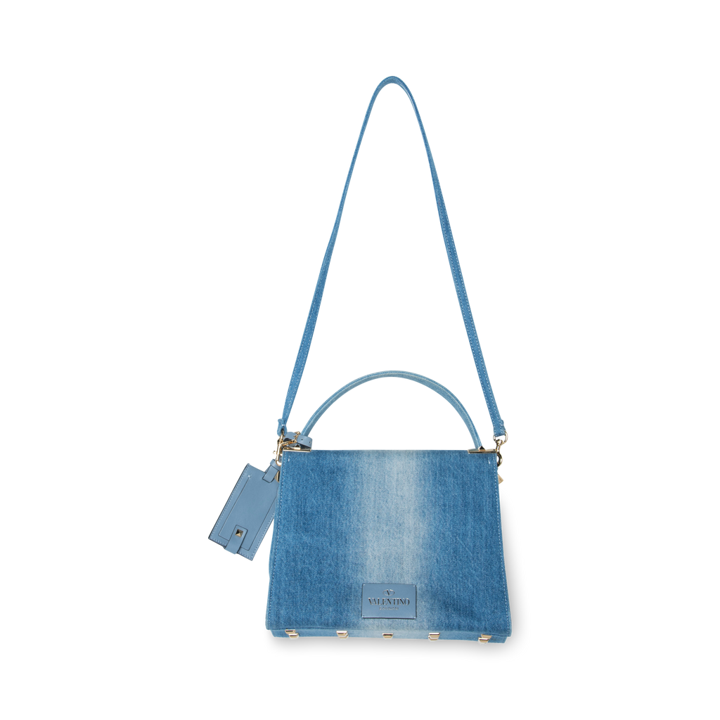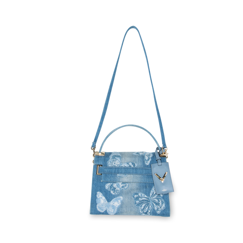 Valentino Garavani Denim Butterfly Bag features gold accents and butterfly design on the back side of bag. The denim shoulder strap is removable.