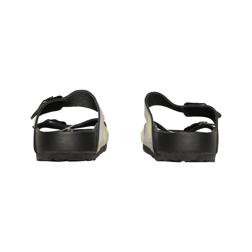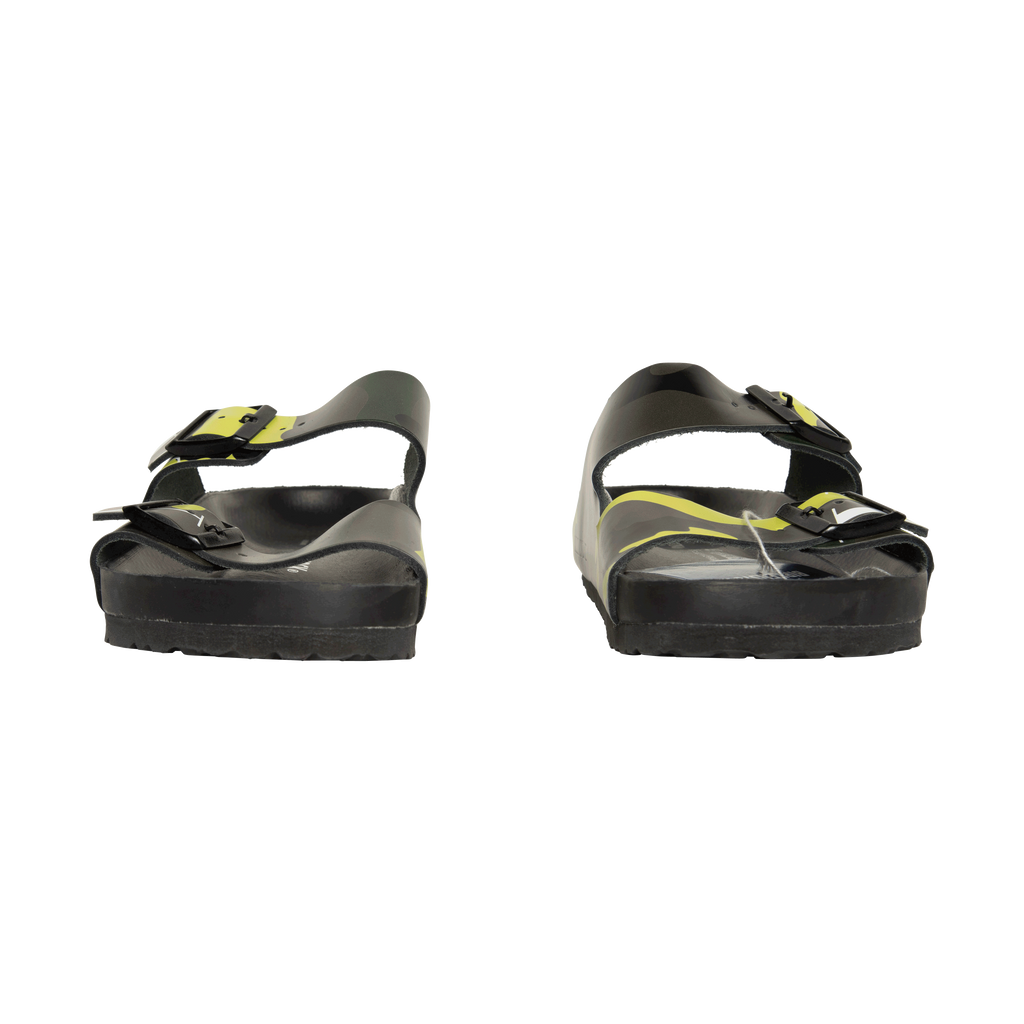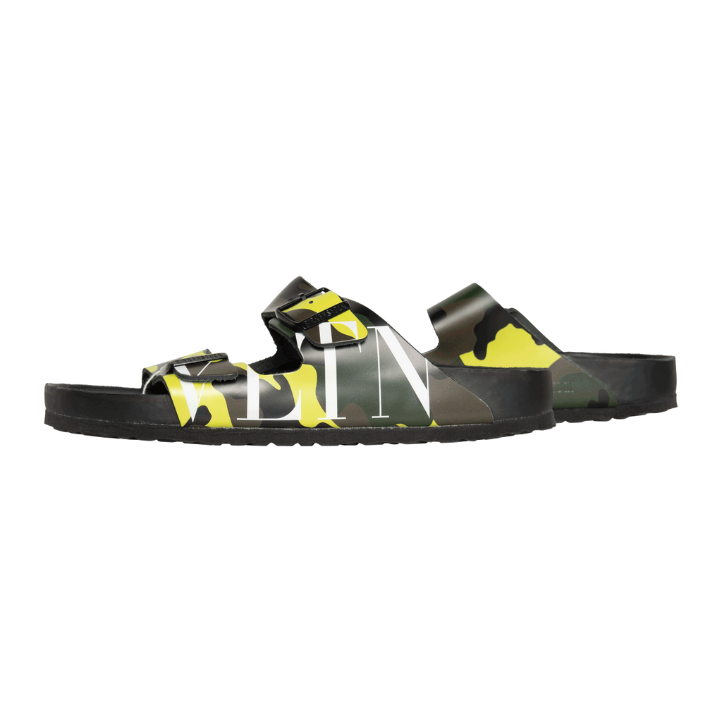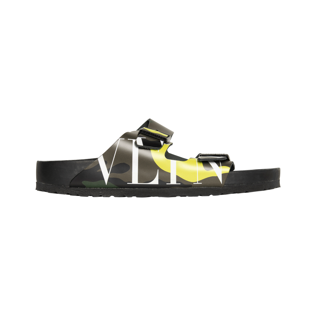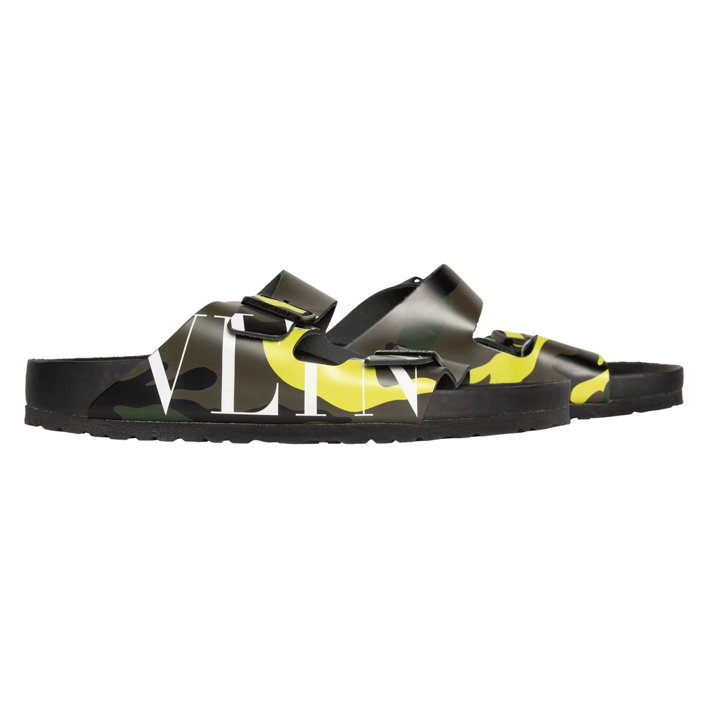 Valentino x Birkenstock Camo Arizona features cork-latex footbed, smooth premium nappa leather, camouflage pattern with iconic VLTN print, and silver Valentino Garavani logo branding in heelcup of footbed.