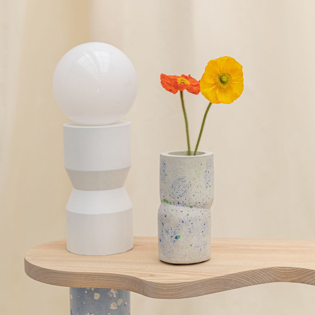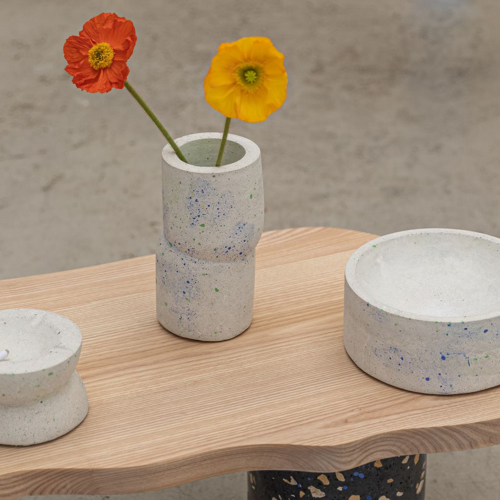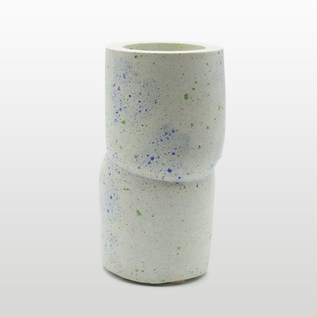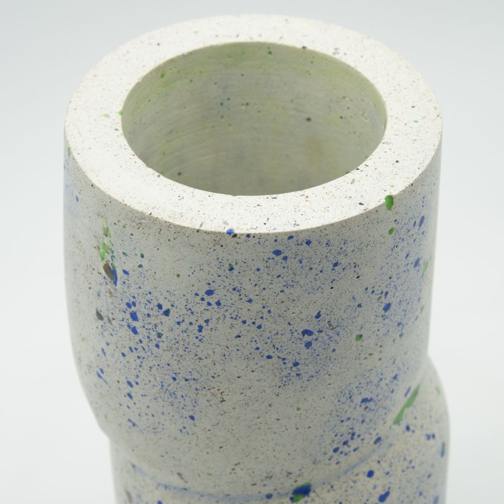 This vase was casted in a light grey terrazzo, it was filled with green and blue plaster and then hand sanded to give it the finish of a smooth natural stone.