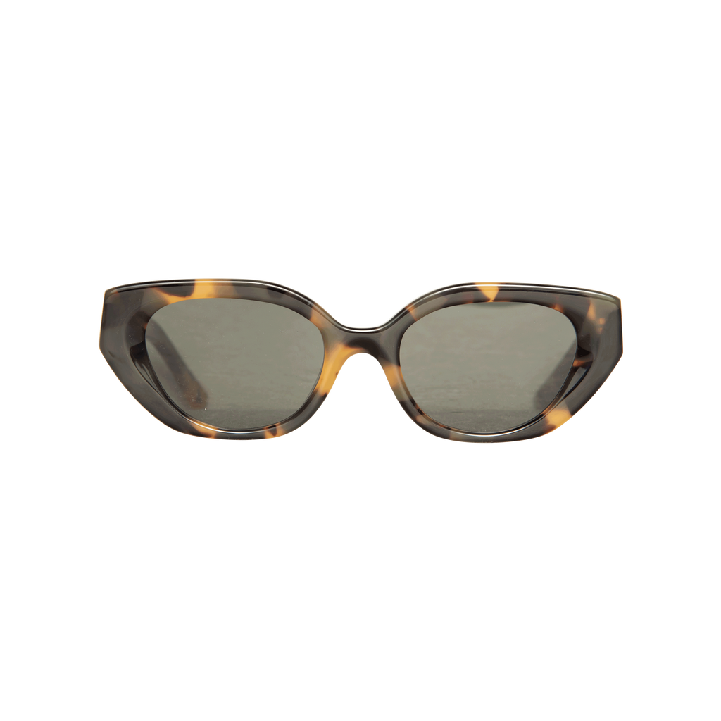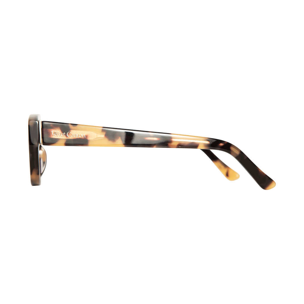 Velvet Canyon Le Chat Sunglasses in Honey Tort features cat eye shape, tortoise shell frames, and black lenses.
