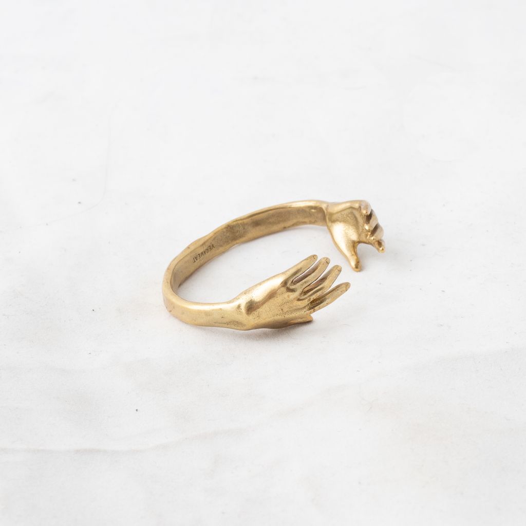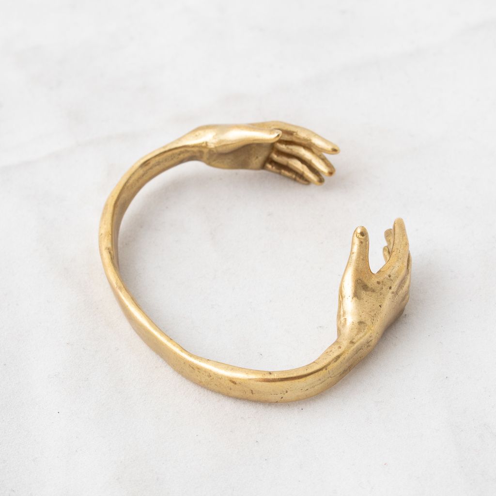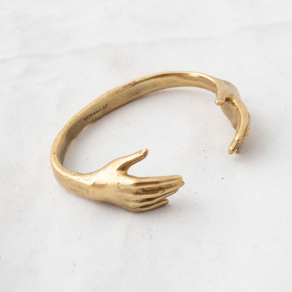 Gently used cuff from Verameat. Open silhouette adjusts slightly, fits most, and is capped with realistically carved little lady hands that keep you happy with hugs all day long! Finished with a logo engraved inside.