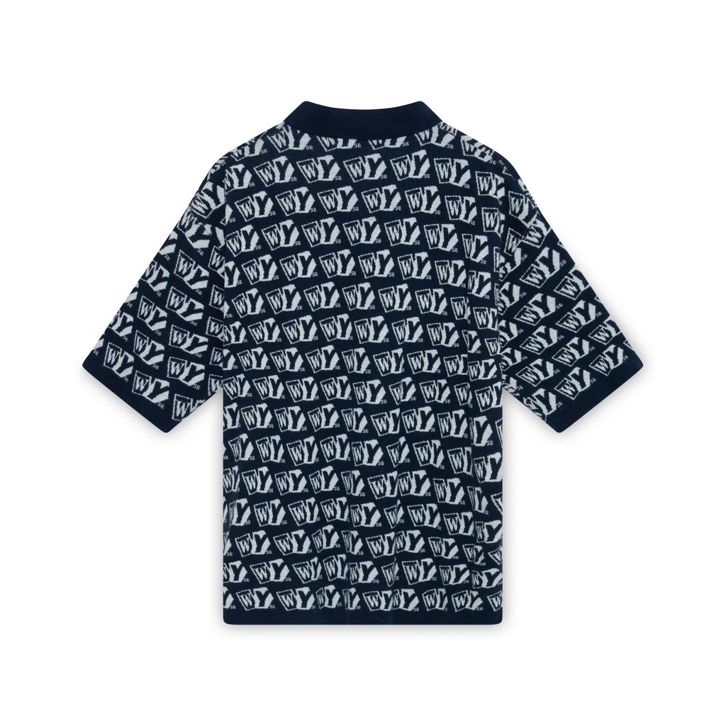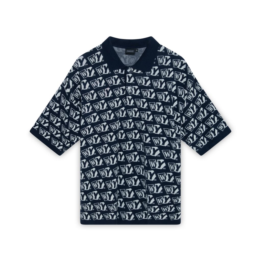 Verdy Wasted Youth knitted polo shirt feature repeat print throughout, ribbing at hems and button collar at front.
