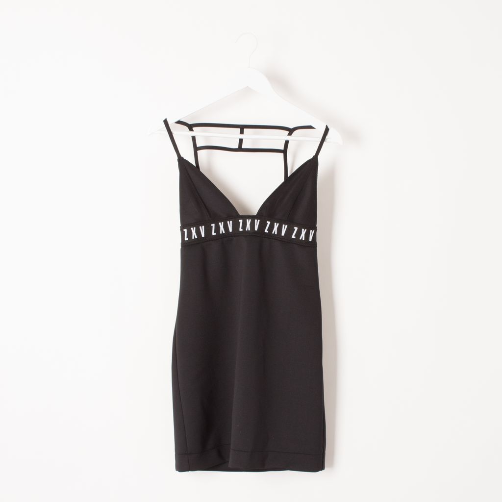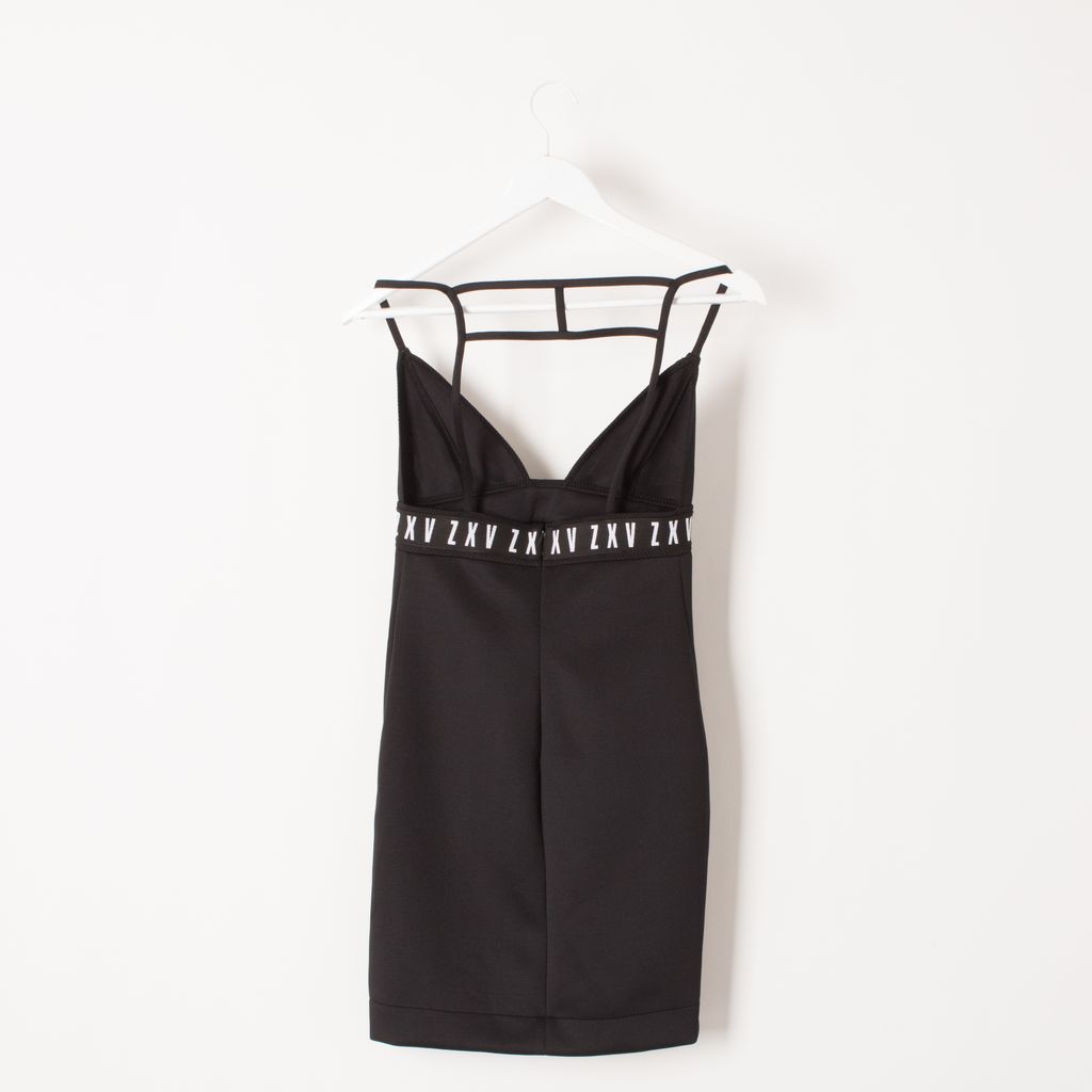 Versace Versus Triangle Top neoprene mini dress, constructed from a light scuba fabric in a black colourway. Details: short length, stretch fabric, cross straps to the back and and a ZXV branded elastic band under the chest.