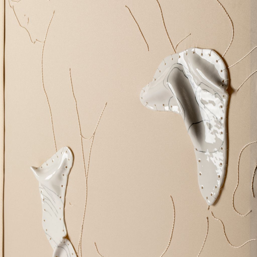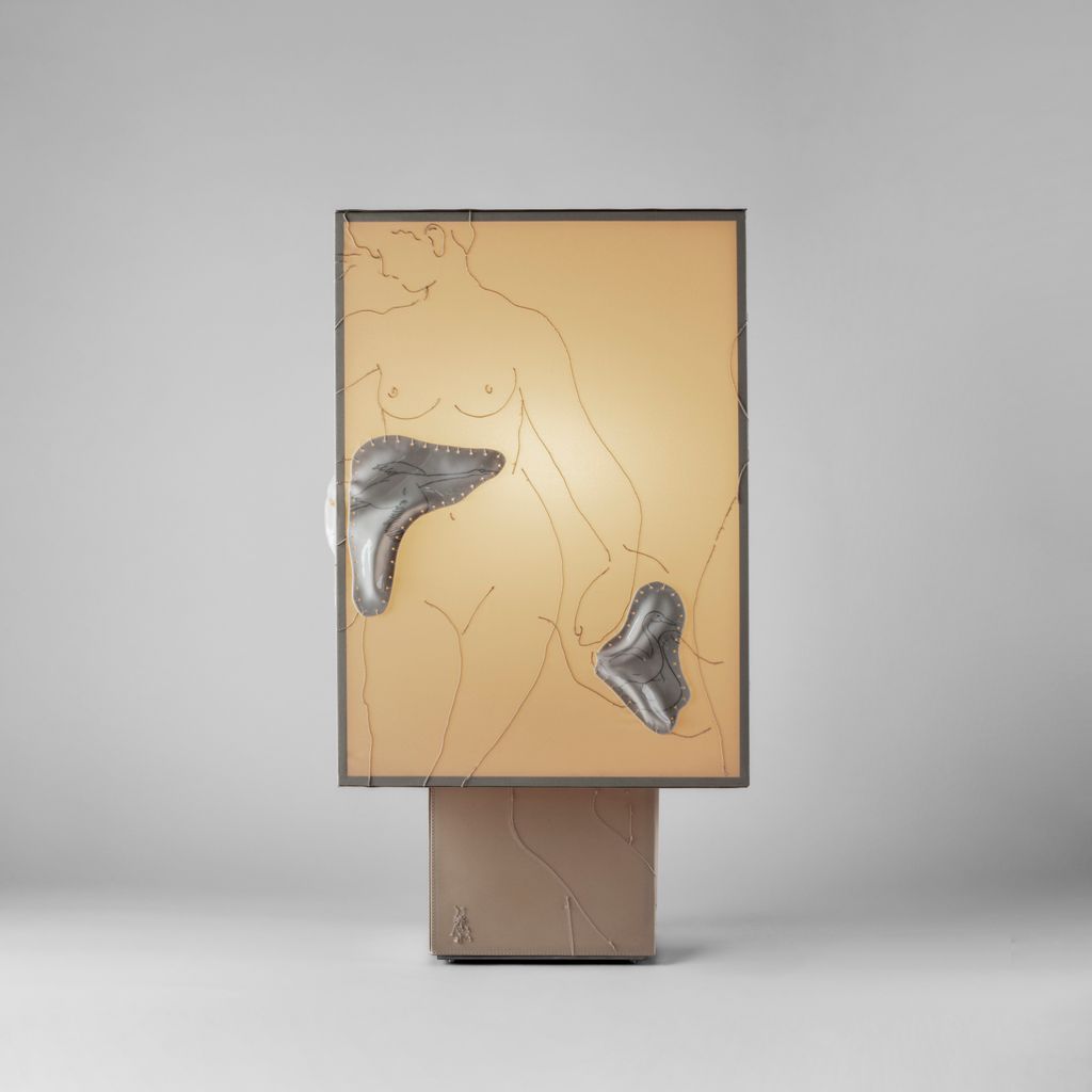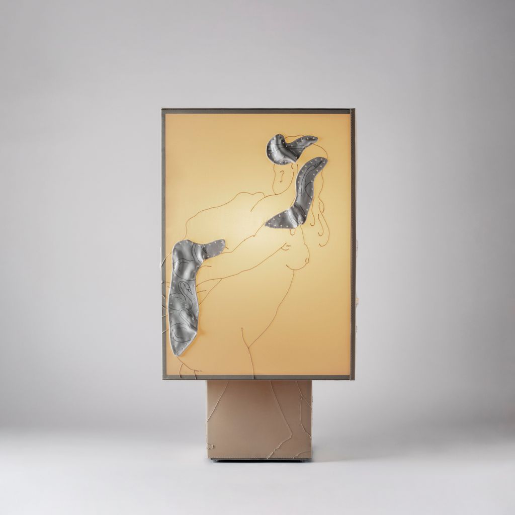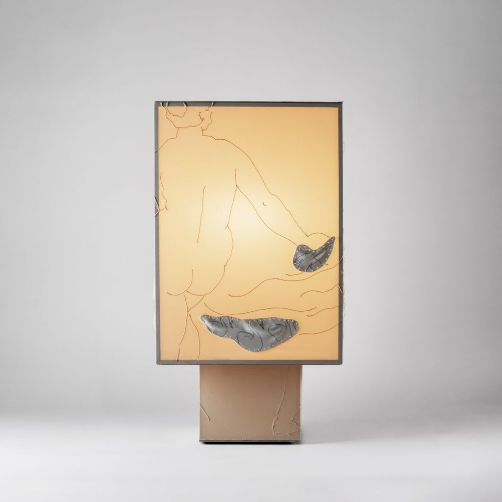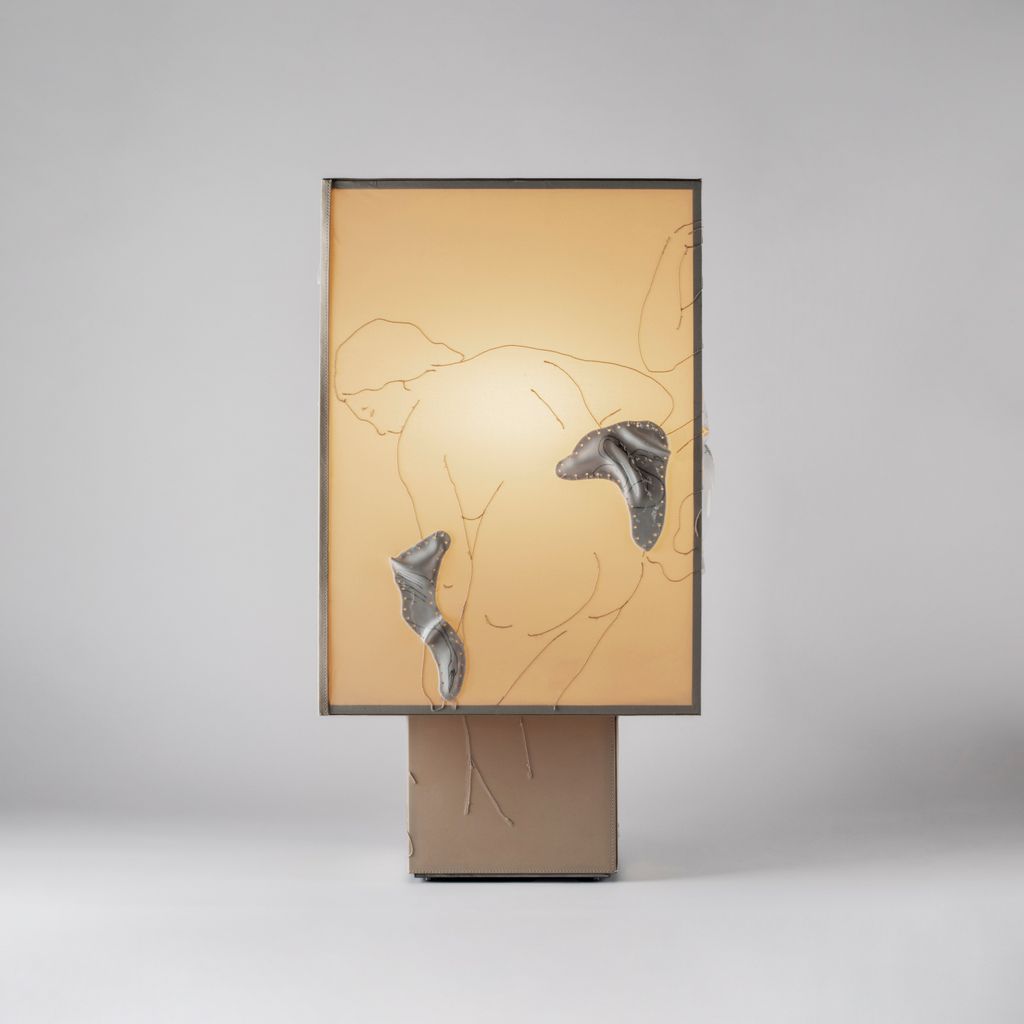 The Vestale lamp, designed by the Amsterdam-based Italian duo CContinua+Mamt, evokes a world suspended between dream and reality, blending Eastern influences with Mediterranean memories — weaving a rich tapestry of cultures and echoes from different times. The lantern features ethereal satin textile volumes, delicately embroidered with hand-guided machines, adorned with decorative patterns inspired by nature and intimate moments of domestic life. Thin sheets of porcelain, hand-molded and decorated are applied to the fabric’s surface, transforming it into a vibrant canvas that enhances its narrative quality.