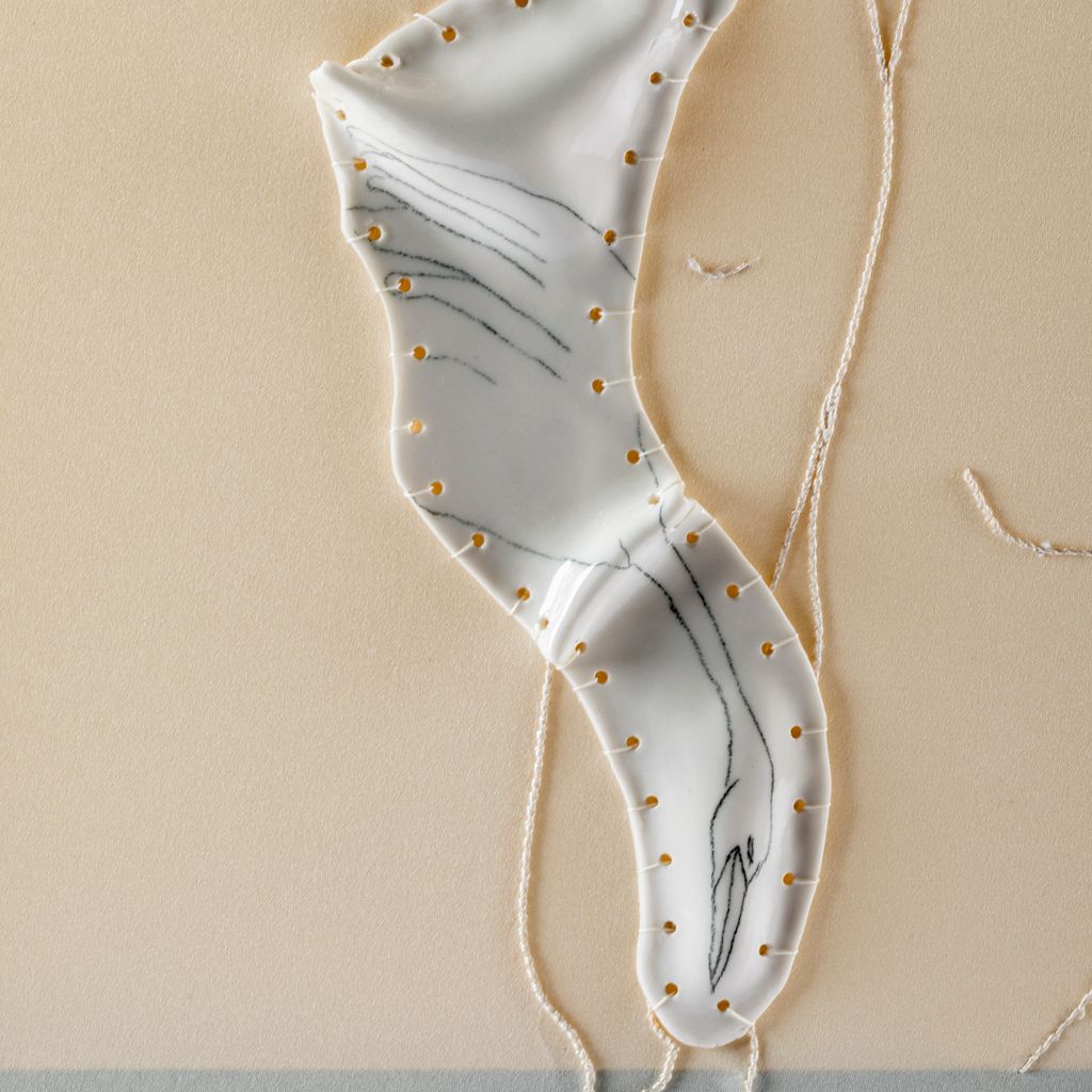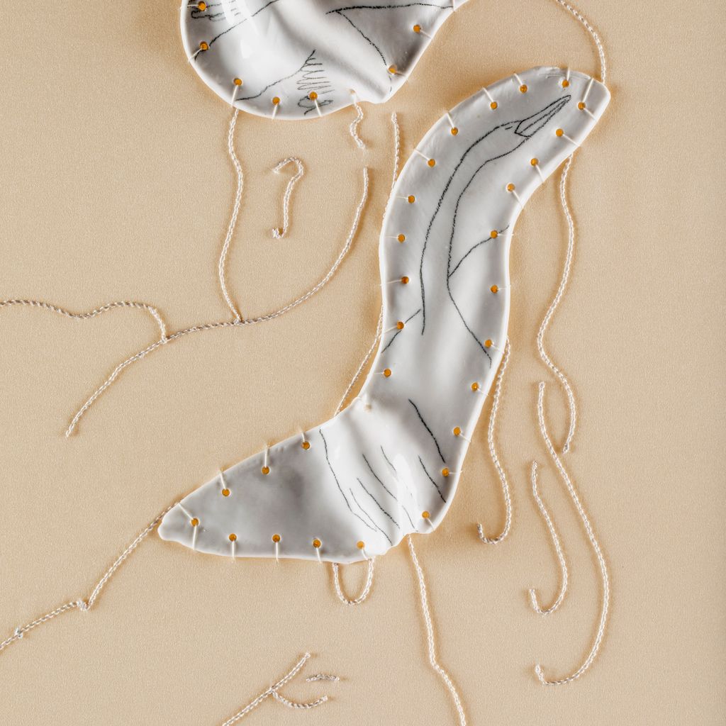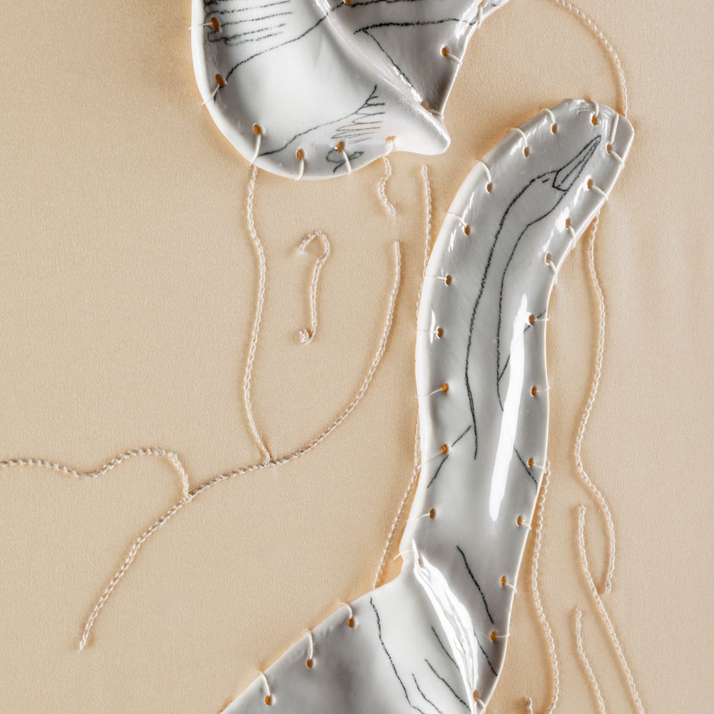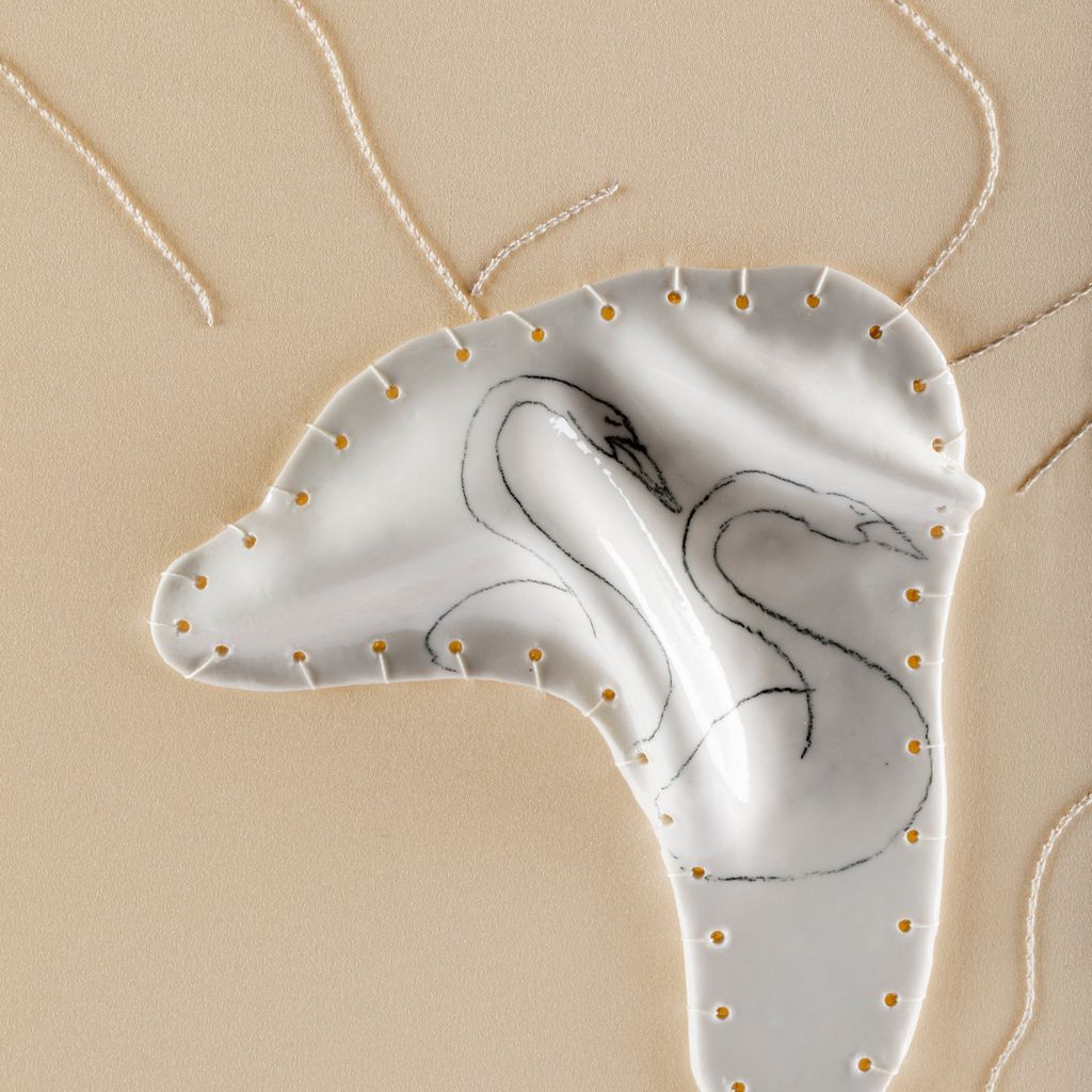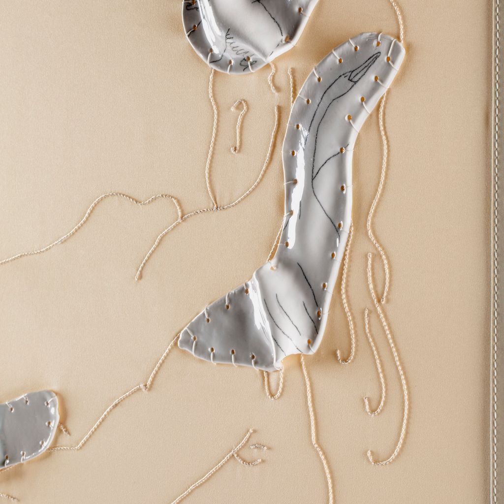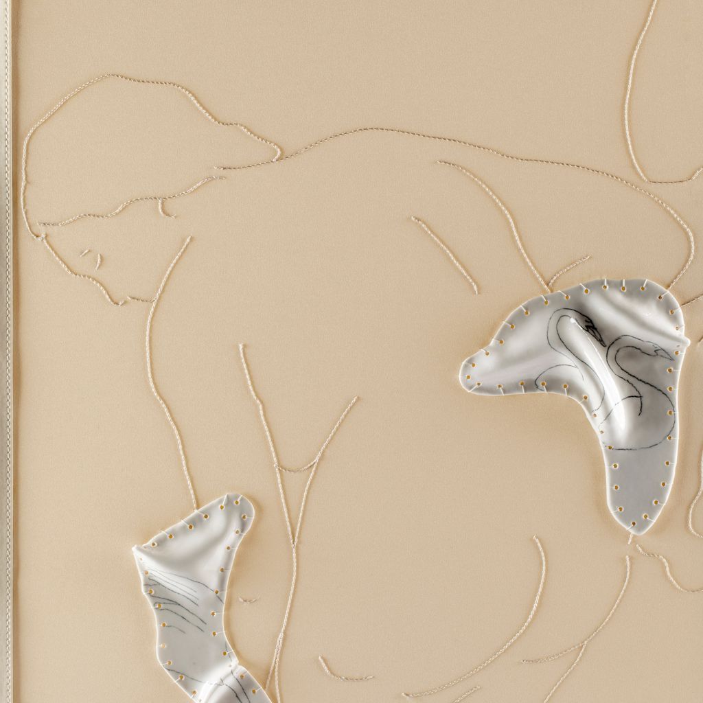 The Vestale lamp, designed by the Amsterdam-based Italian duo CContinua+Mamt, evokes a world suspended between dream and reality, blending Eastern influences with Mediterranean memories — weaving a rich tapestry of cultures and echoes from different times. The lantern features ethereal satin textile volumes, delicately embroidered with hand-guided machines, adorned with decorative patterns inspired by nature and intimate moments of domestic life. Thin sheets of porcelain, hand-molded and decorated are applied to the fabric’s surface, transforming it into a vibrant canvas that enhances its narrative quality.