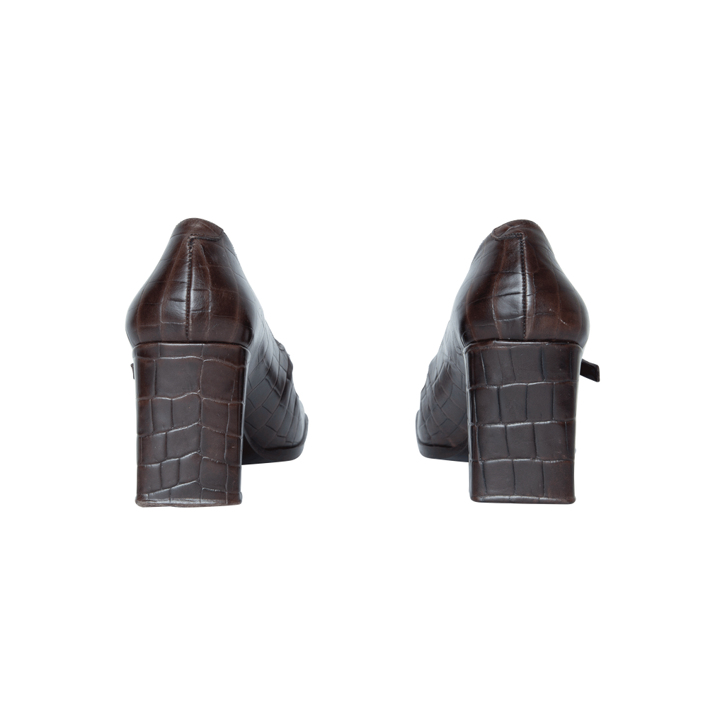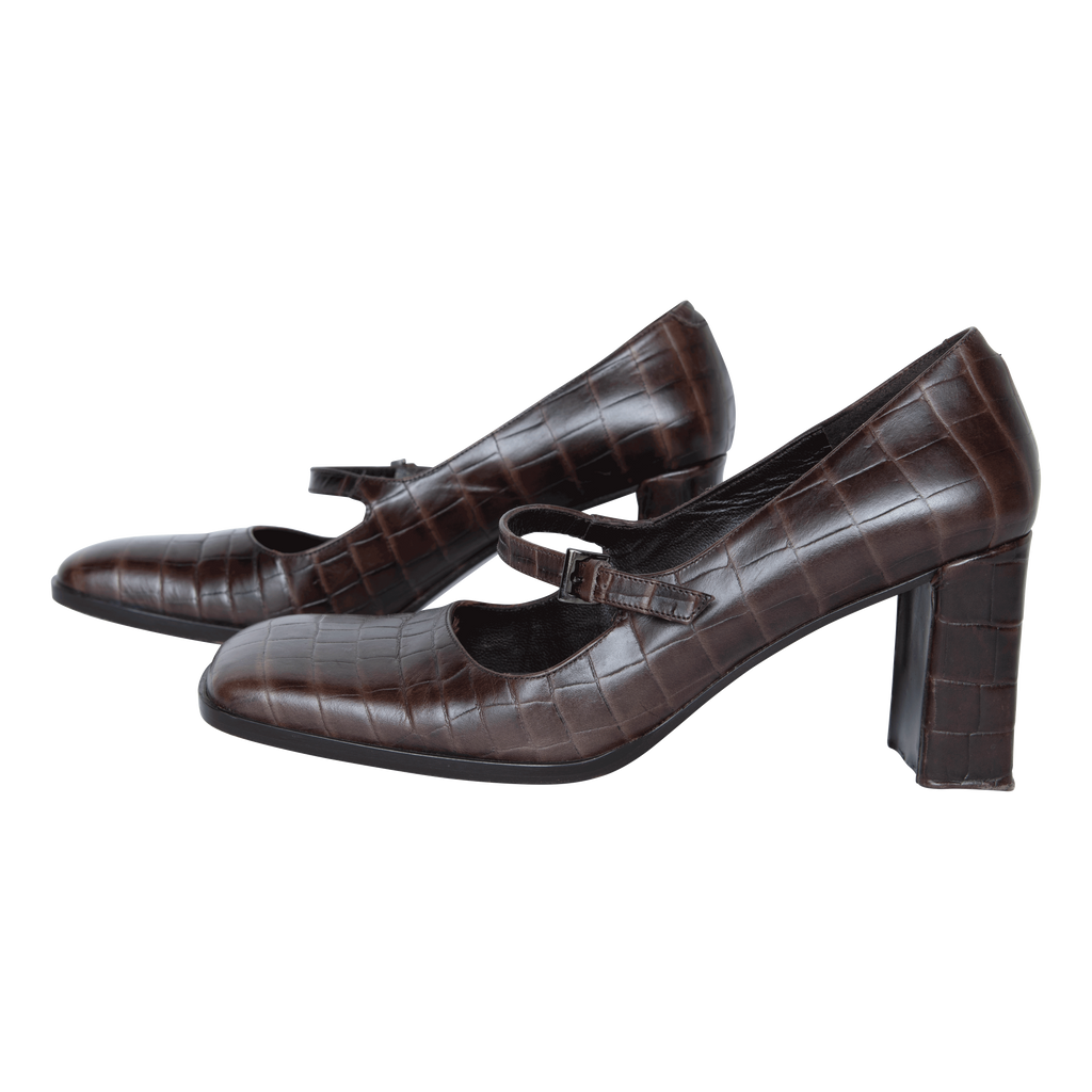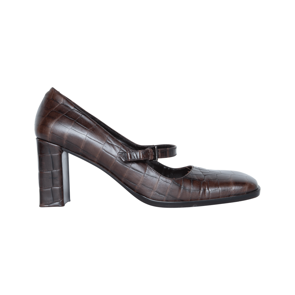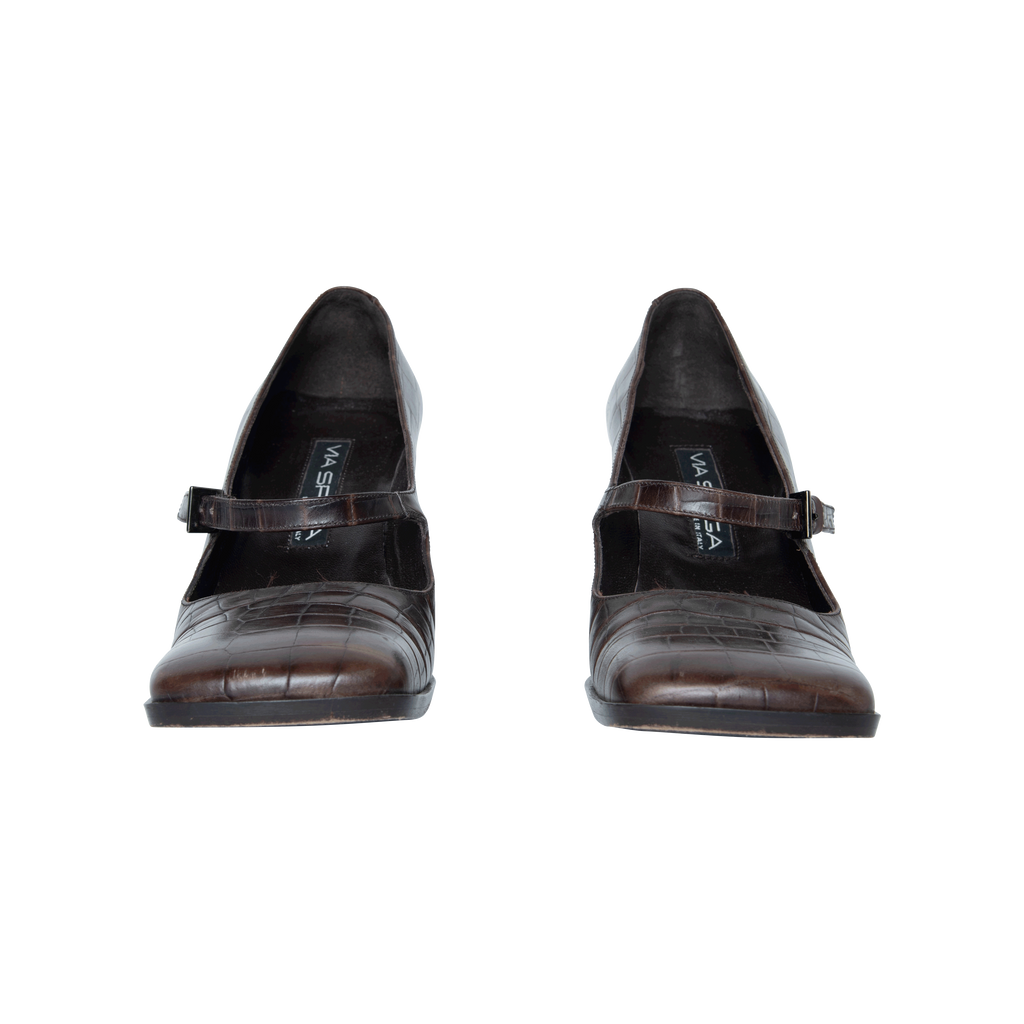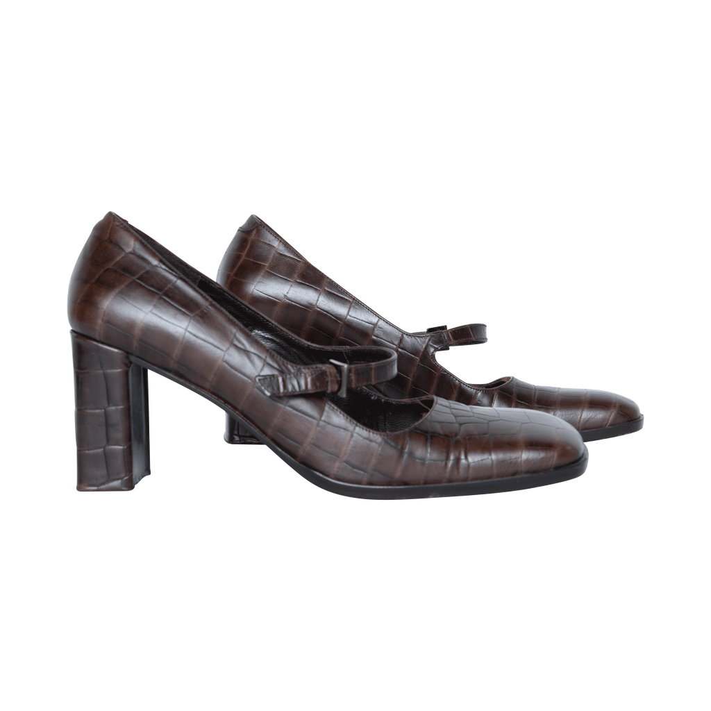 Via Spiga Brown Crocodile Mary Jane Heels features square toe, block heel, and single buckle strap.