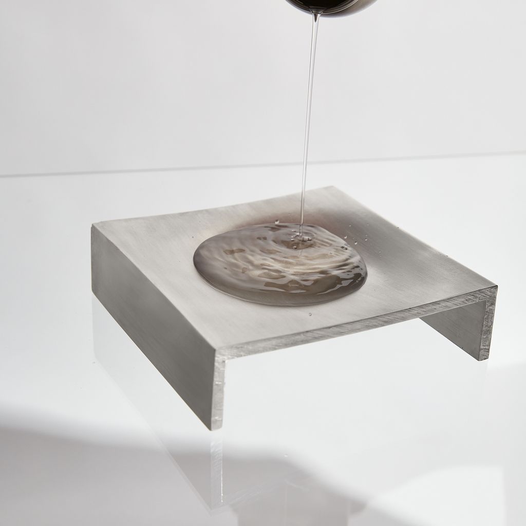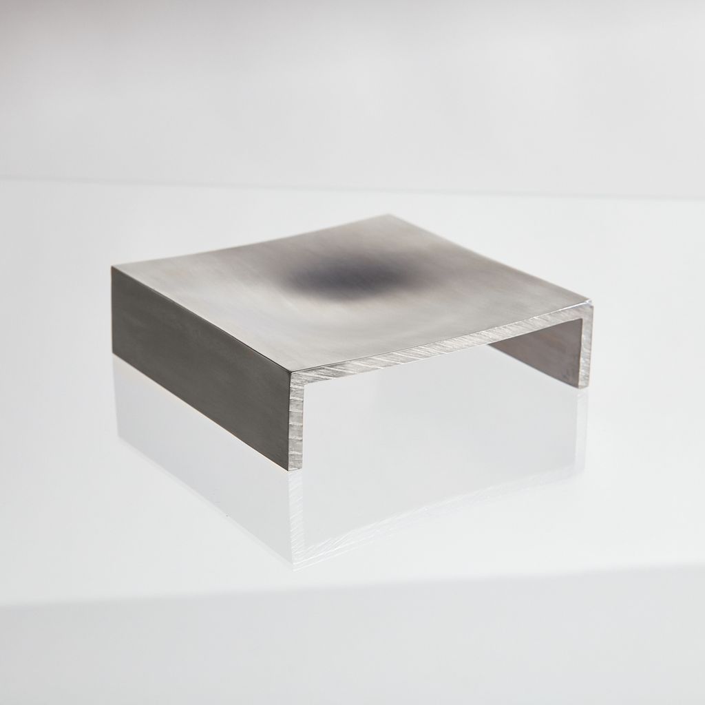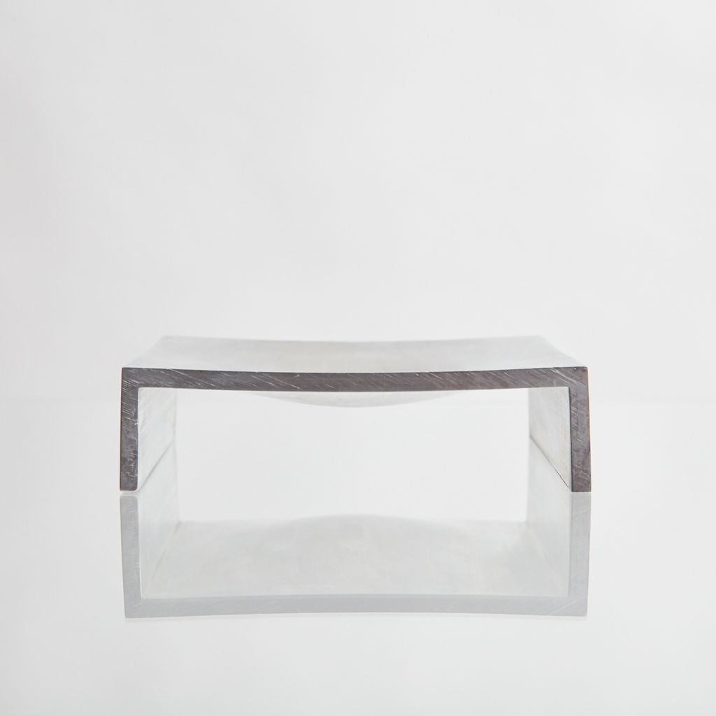 The “vide-poche” is obtained by the deformation of a square aluminum extrusion. Ten tons of pressure emitted on the upper side of this part result in the formation of a well-proportioned cavity inviting to deposit various small objects. The lower protrusion created by this same pressure is made visible laterally due to the longitudinal cut. Two major steps, one pressure and then a cut, generate the simple and practical shape of the object.