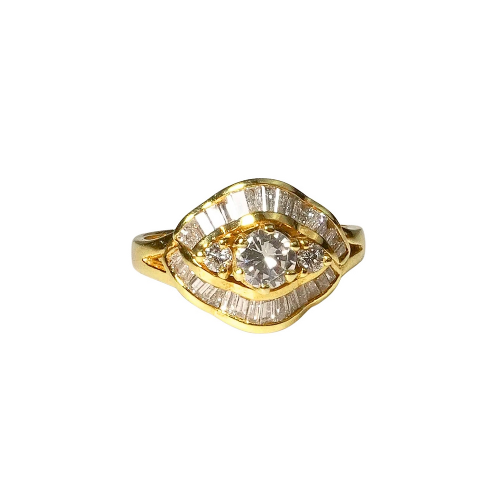 A sculptural Mid-Century inspired gem. Crafted in 14k yellow gold , this ring showcases a flowing ribbon motif set with 30 channel-set baguette diamonds that wrap around three round brilliant-cut diamonds—a 4.5mm center stone flanked by two 2.2mm accents. The dimensional wave design measures 12mm high by 14.9mm wide , creating striking movement and vintage glamour. Beautiful as an engagement ring or a statement piece.