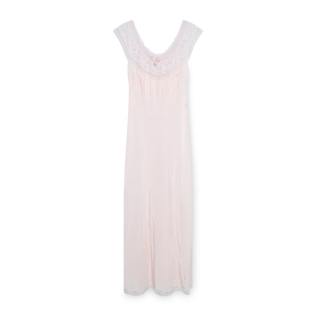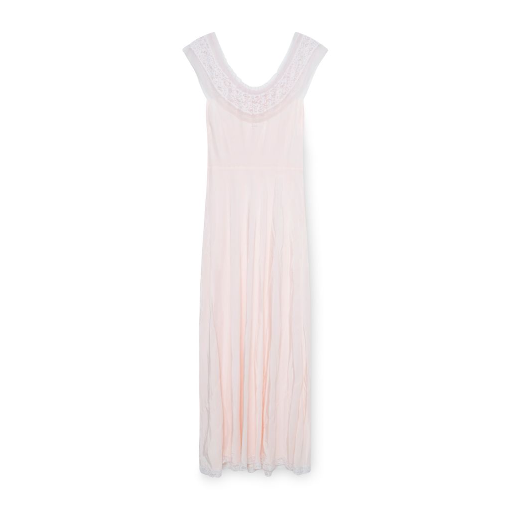 Vintage 1940’s nightgown features lace details at bust and hem, elastic neckline, and center bow detail at front.