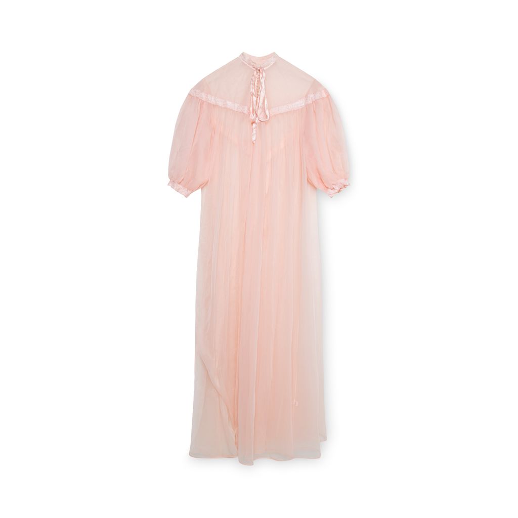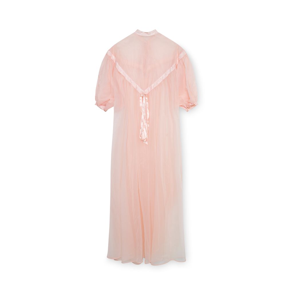 Vintage 1950’s bed coat features crystal embellishments at front, tie at neckline, lace trimming details throughout and at cuffs,, and snap closure at front.