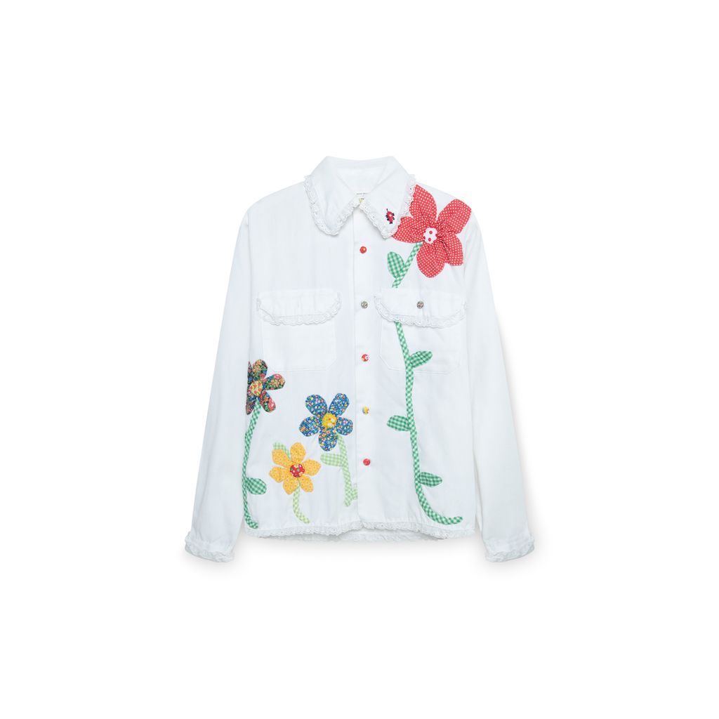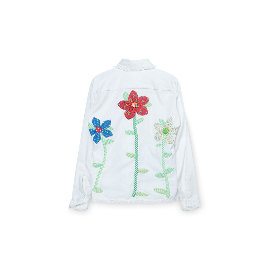 Vintage 1950’s Big Mac button up shirt features floral patchwork throughout, button up with frilly eyelet details on hem and cuff, and super sweet details on center button front.