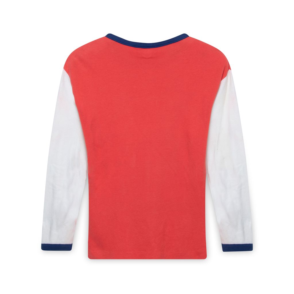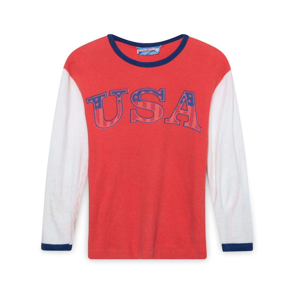 Vintage 1960s USA raglan shirt features graphic at front, distressed details throughout, contrast sleeves, and single stitching at hem.