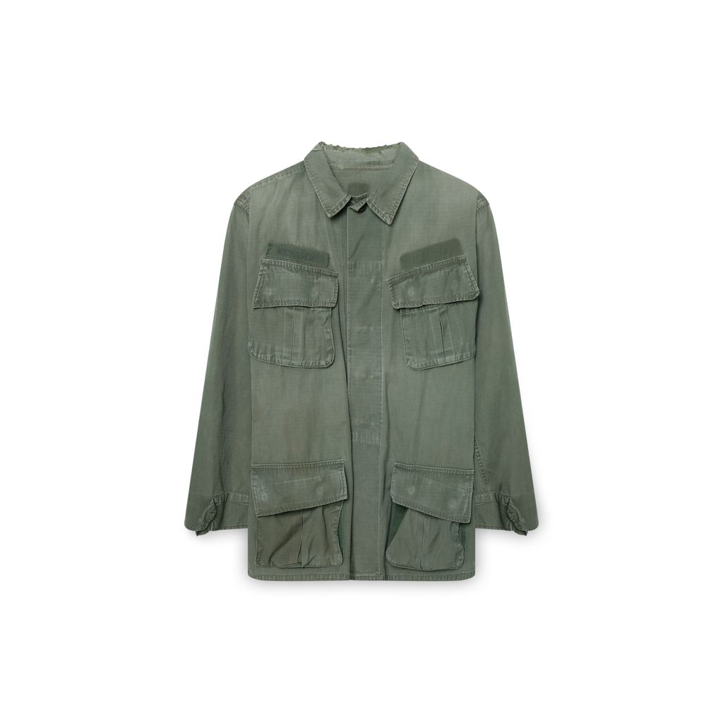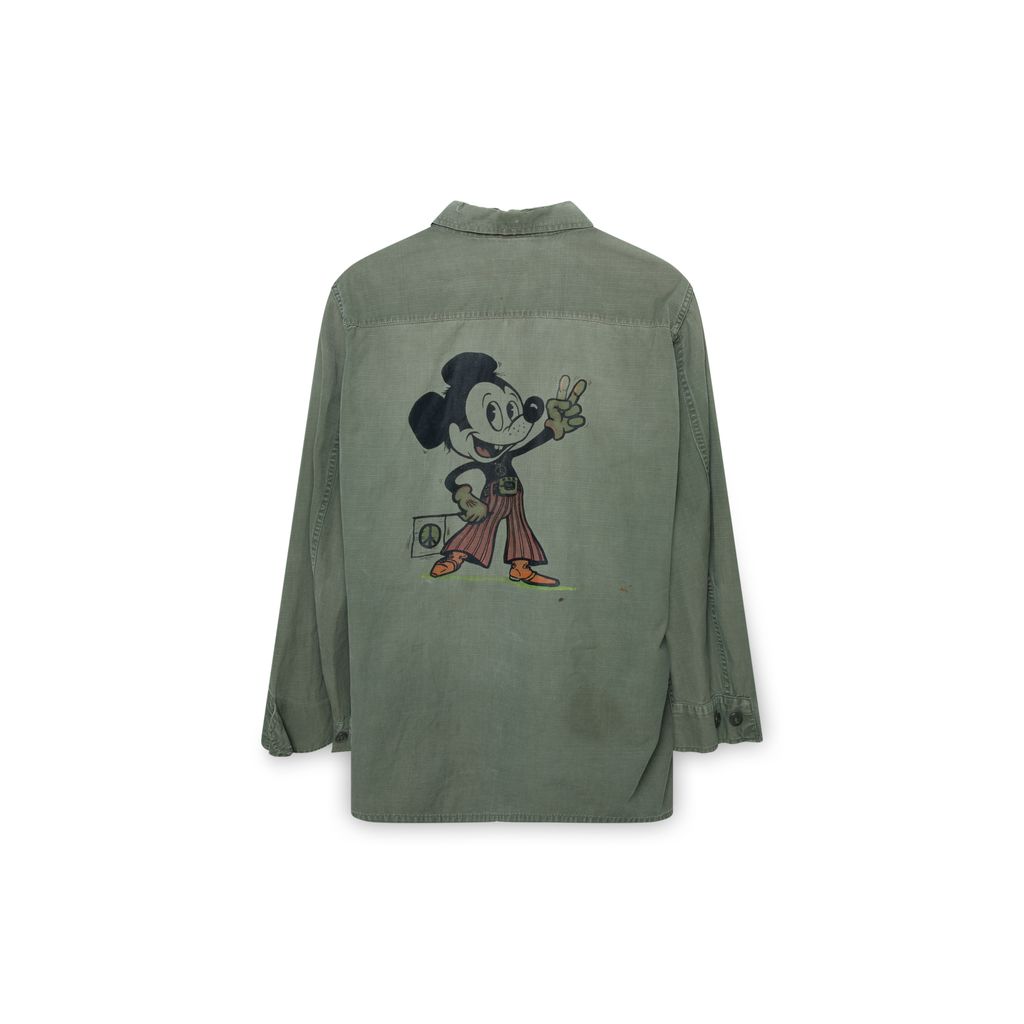 Vintage 1960s Vietnam Mickey Mouse army jacket features Mickey Mouse graphic at back, distressed details throughout, four cargo pockets at front, and button front closure.