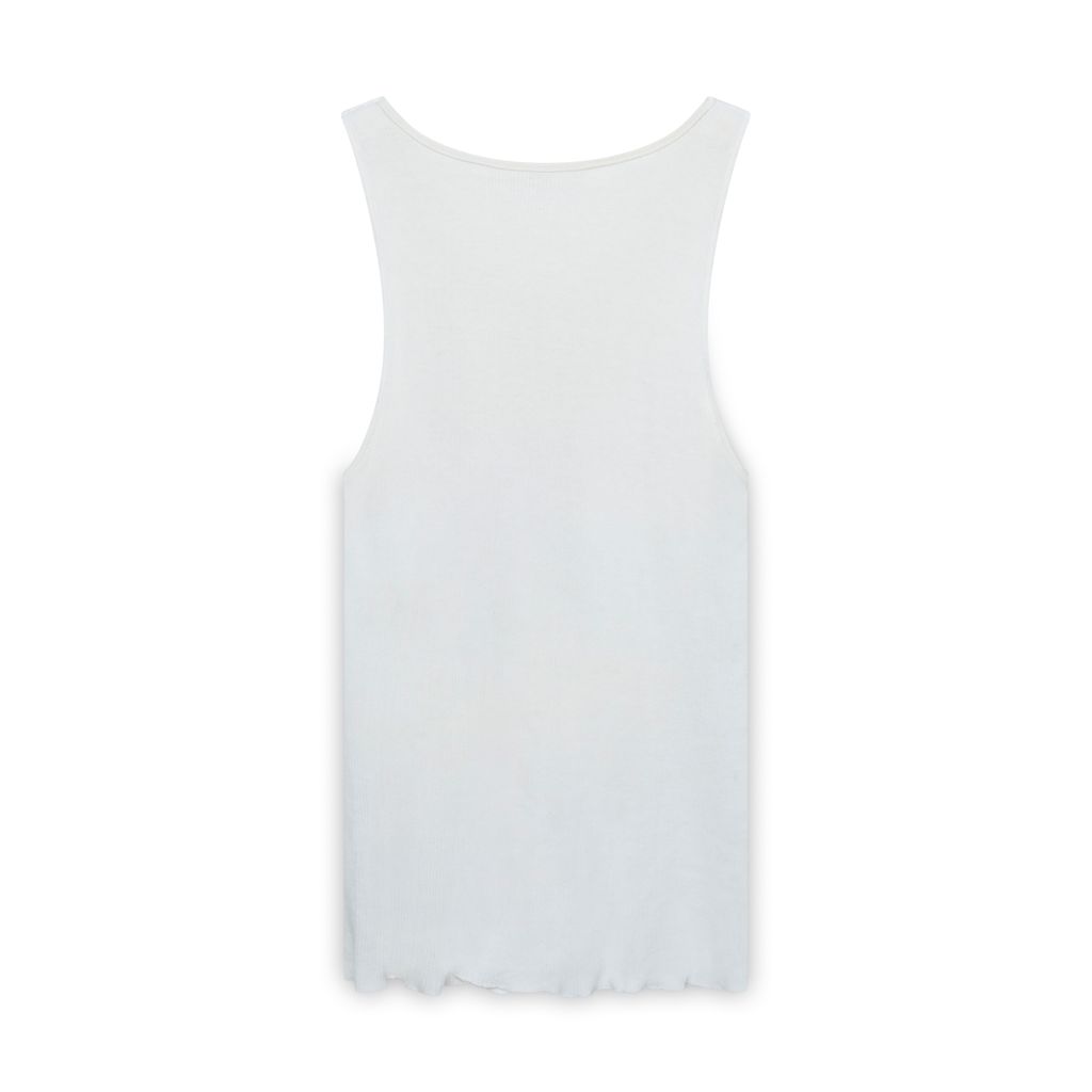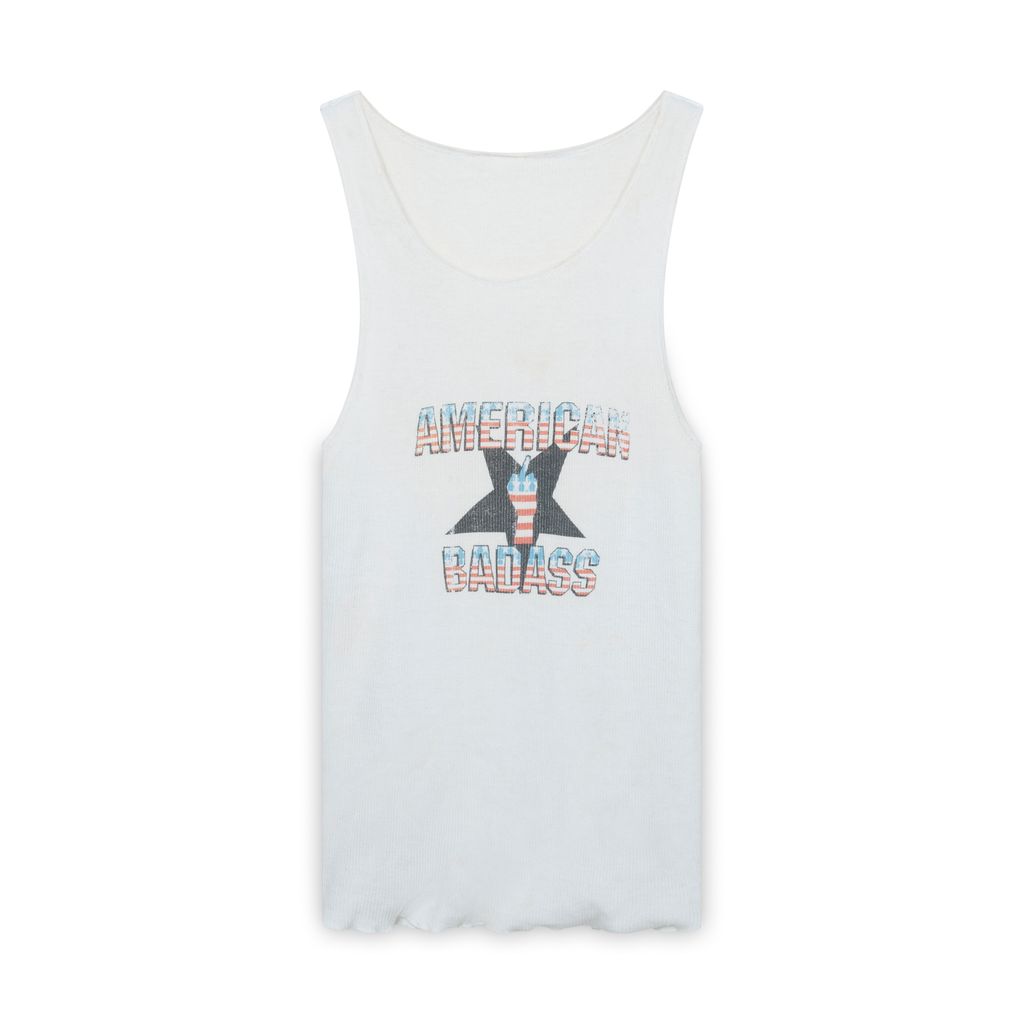 Vintage 1970s American Badass Rib Tank Top features graphic printed inside out, natural distressed throughout, and raw hem.