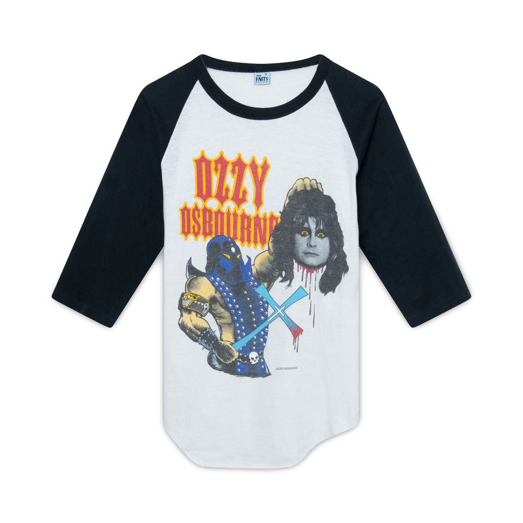 Vintage 1982 Ozzy Osborne raglan shirt features graphic at front, contrast sleeves, and single stitching at sleeves. Shirt has distressed details throughout.