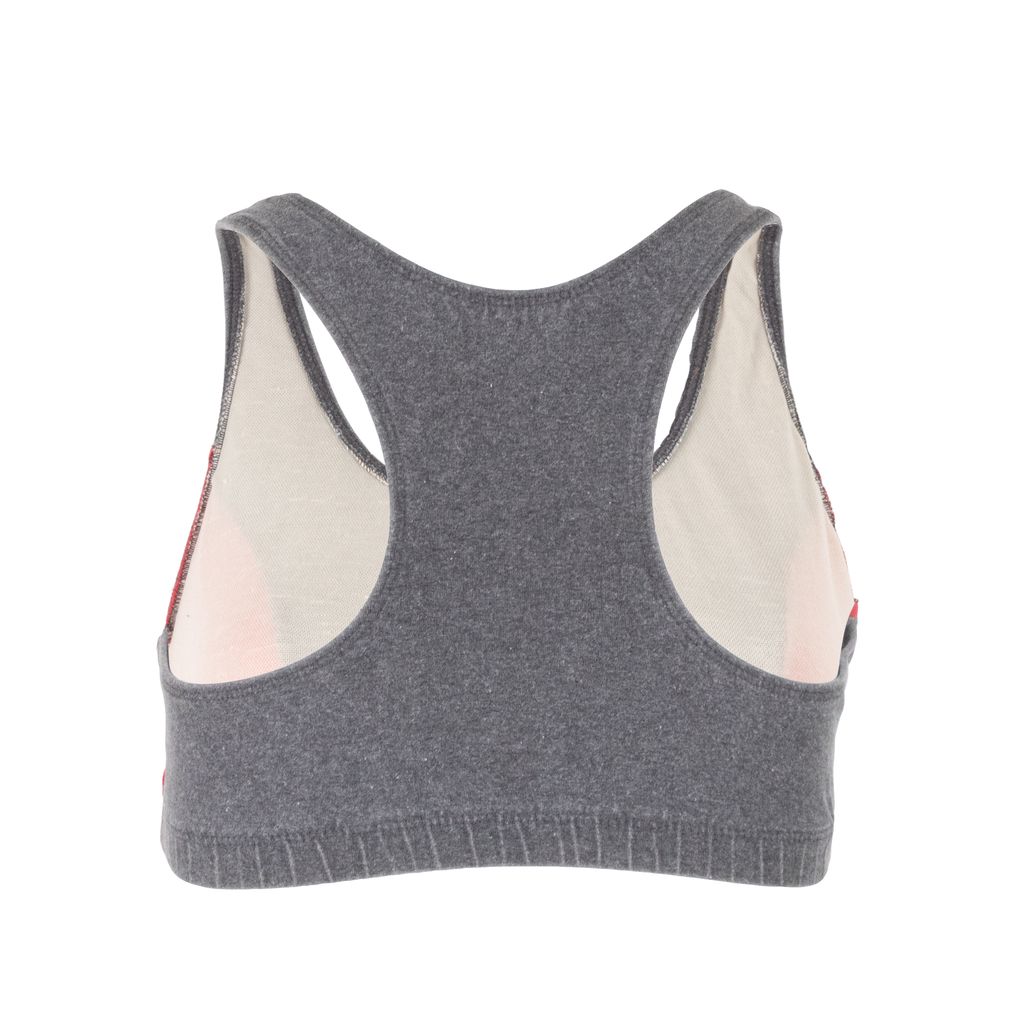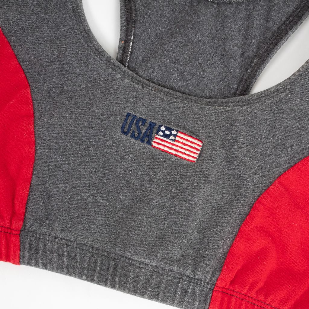 Show off your patriotic side in this vintage USA sports bra. Features duotoned paneled body, scoop shaped neck, Y-shaped back, elastic at bottom, and USA text and flag embroidery on chest.