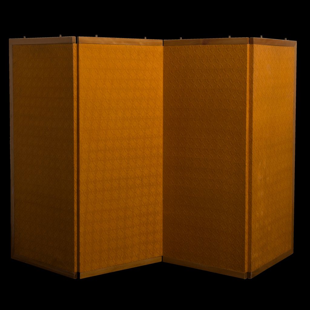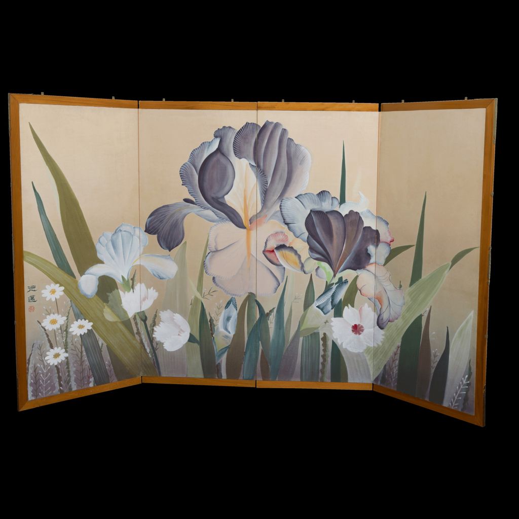 Made from wood, this beautifully painted partition would make for excellent room decoration or to section off an area in your home. Folds flat for easy storage. Features intricate brass pegs. In good condition.