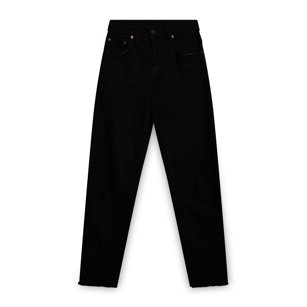 Vintage 550 Levis features hight waist, tapered fit, five pocket, raw hem, and zipper/button closure at front.