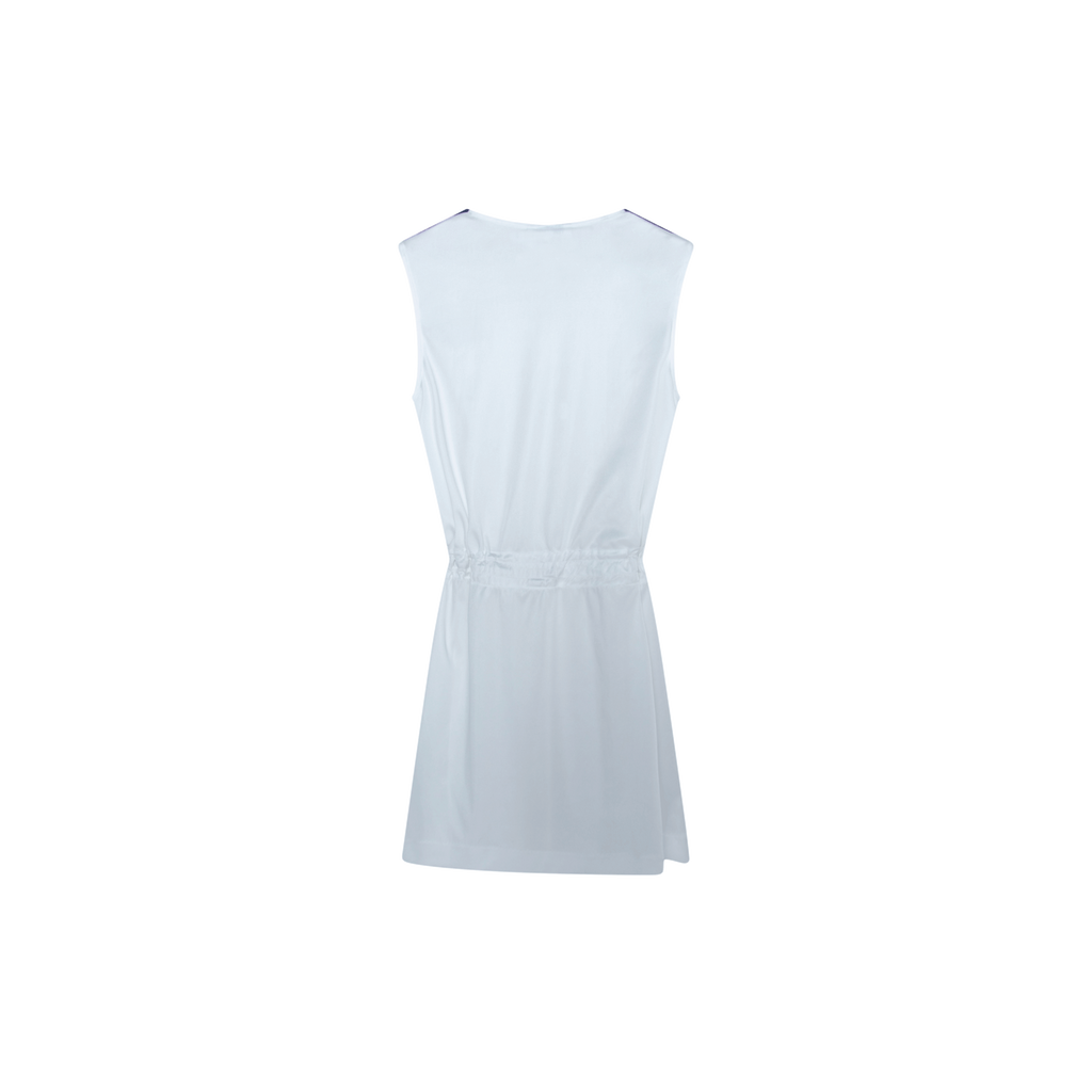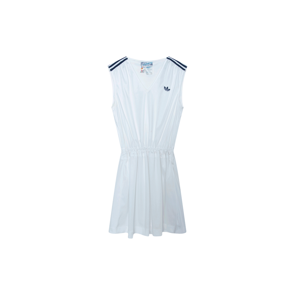 Vintage Adidas Tennis Dress features elasticized waistband, V-neck, 3 stripe design on shoulders, and embroidered logo on chest.