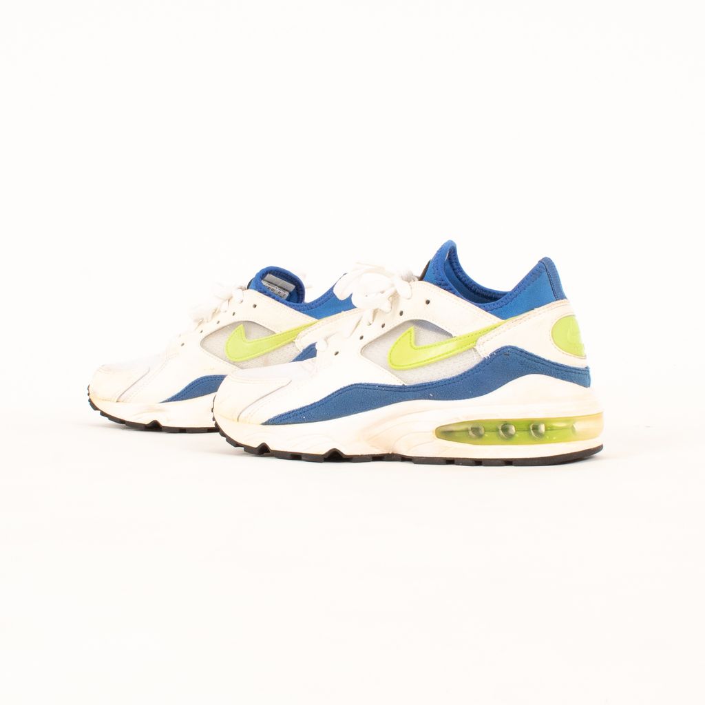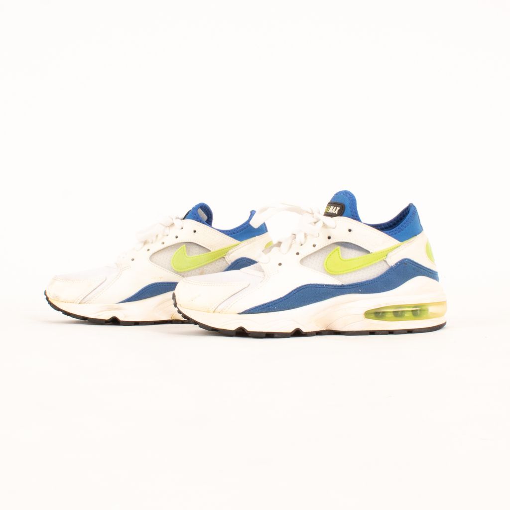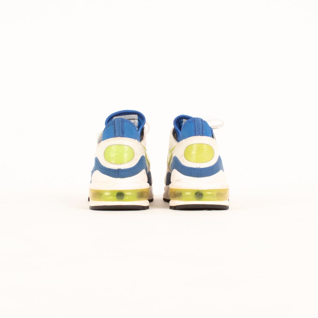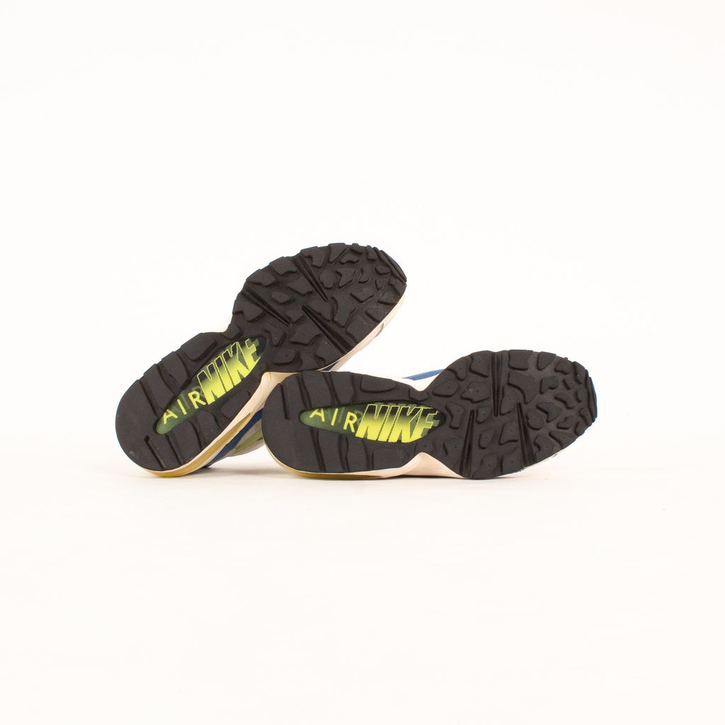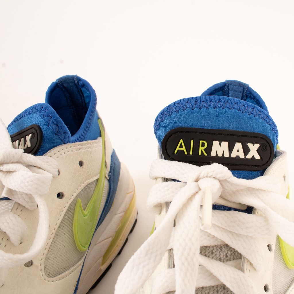 A retro-futuristic take on a classic silhouette from Nike, these sneaker combine the iconic Air Max style with neon colorways and space age materials. Features tricolor body, scuba knit fabrication at tongue and ankle, smoky plasticine cutout with neon Nike swoosh overlay on sides, neon green heel insert, and Air Max branding on soles and tongues.
