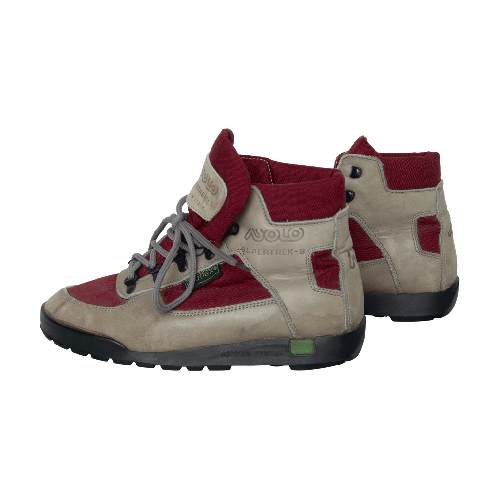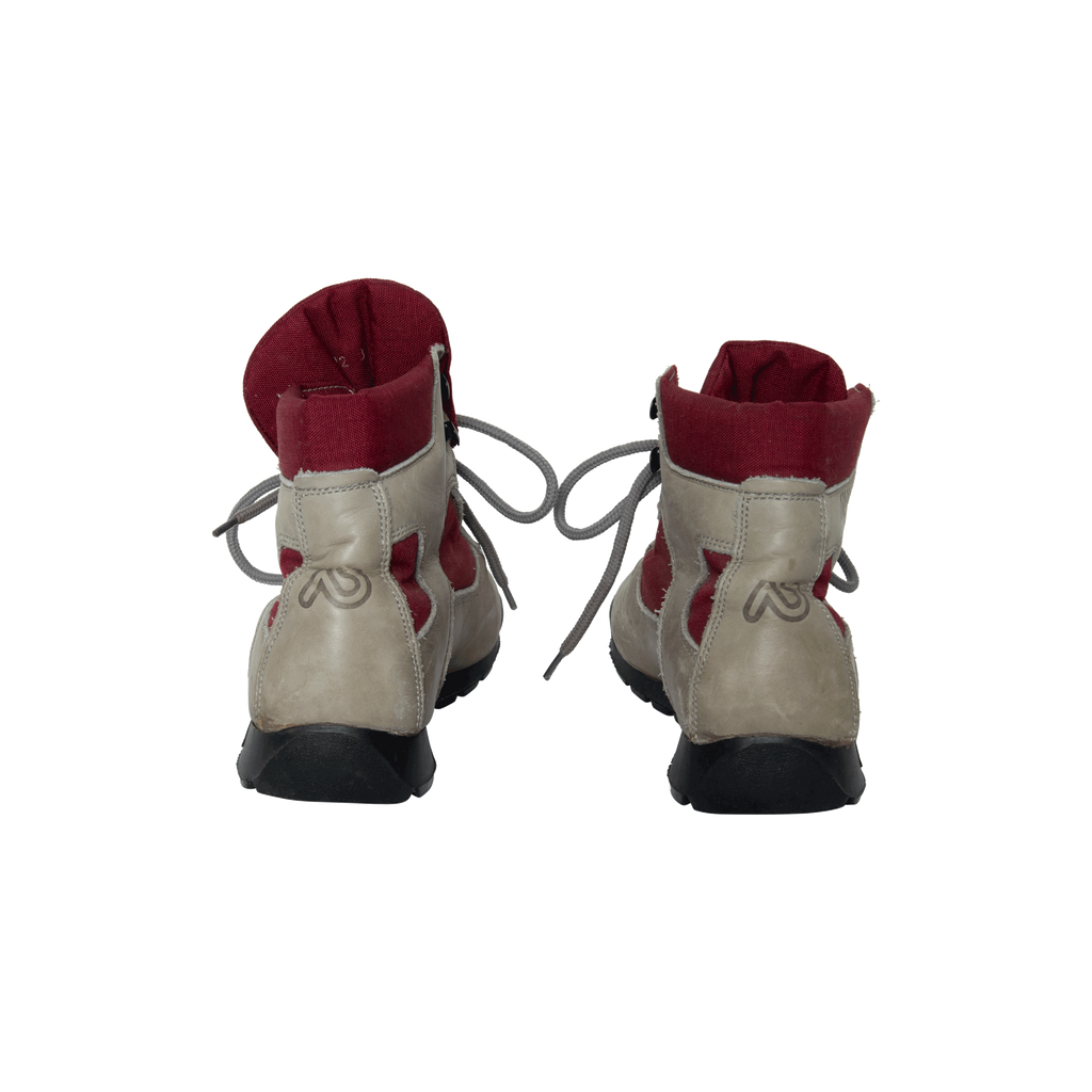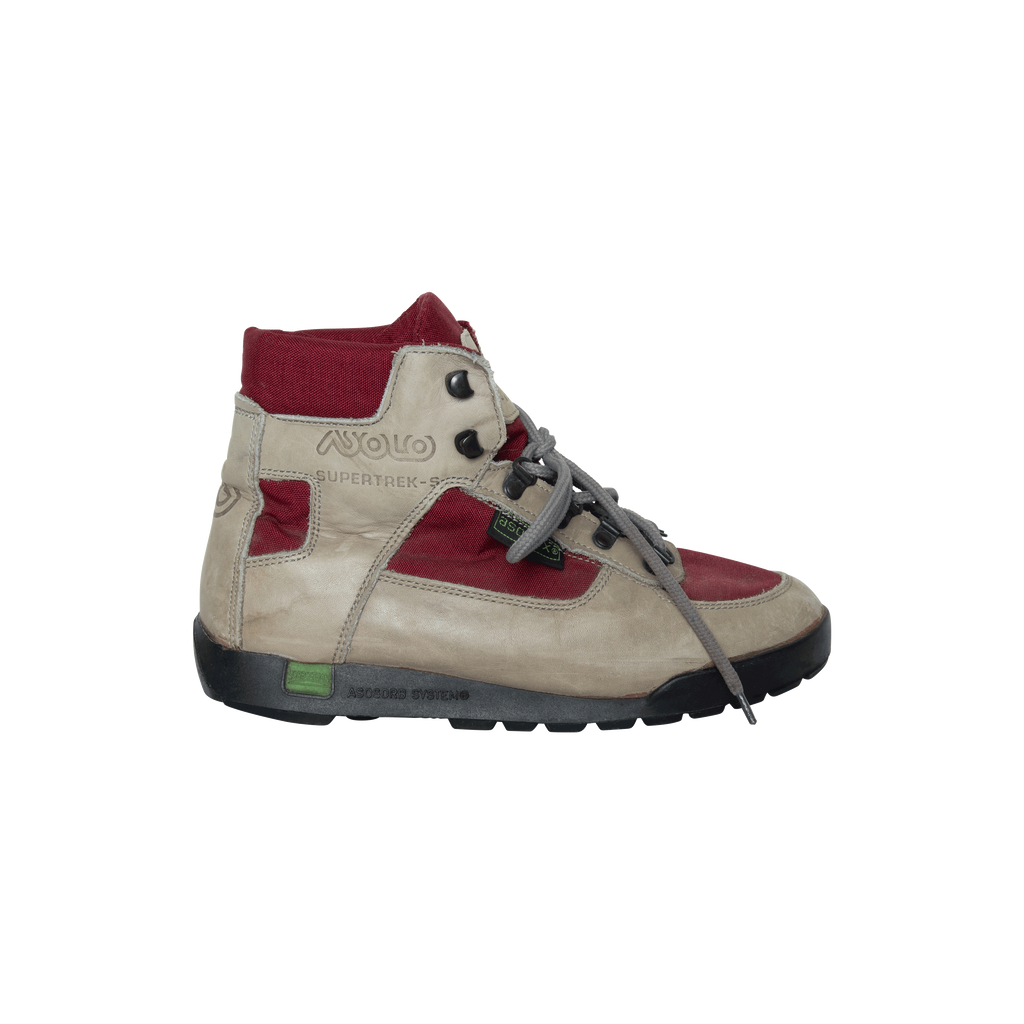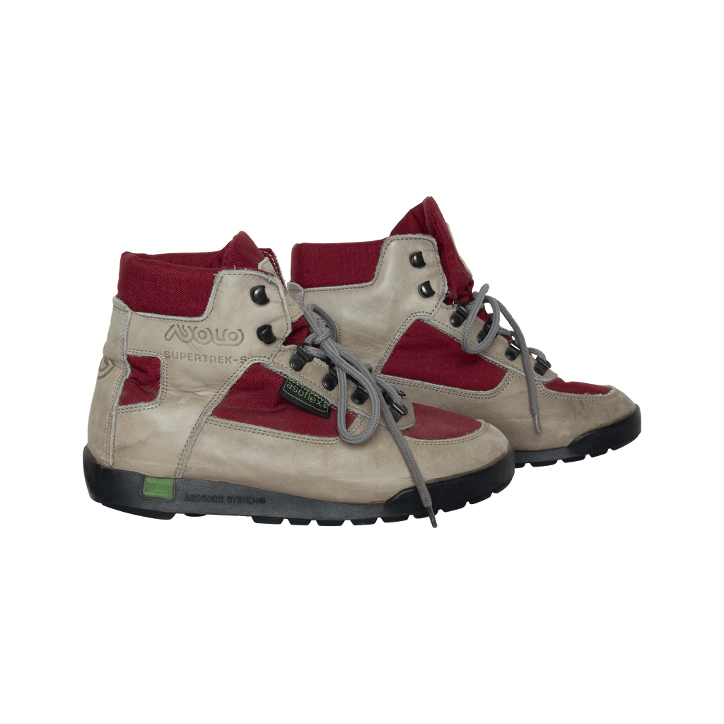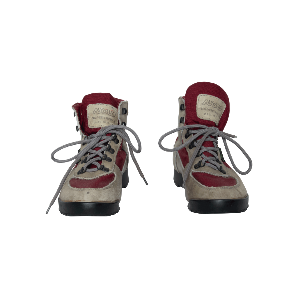 Vintage Asolo Maroon and Beige Hiking Boots features lace closure, canvas and leather materials, and high top.