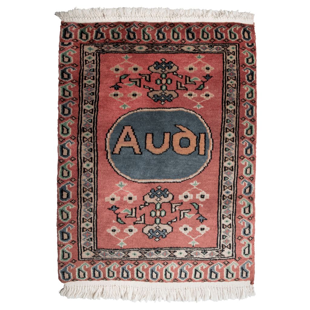 Vintage Audi Afghan Rug features Audi logo in red and blue.